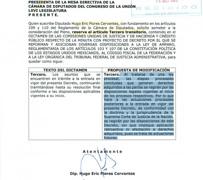 CIUDAD DE MÉXICO, 15 de octubre.- Tras 14 horas de debate, los diputados de la alianza Morena-PVEM-PT aprobaron la reforma a la Ley de Amparo en lo general y particular, incluyendo el aval a una modificación por reserva propuesta por el diputado Hugo Eric Flores Cervantes, que reenciende la polémica sobre el carácter retroactivo de la reforma, pues permite aplicar la reforma a las nuevas etapas de los juicios que están en curso.