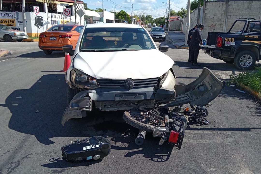 MÉRIDA, YUC.- 20 de agosto.- Un motociclista se metió en un doble problema, pues primero chocó en Cinco Colonias y luego se puso a mover sus placas, lo que llamó la atención de los policías.