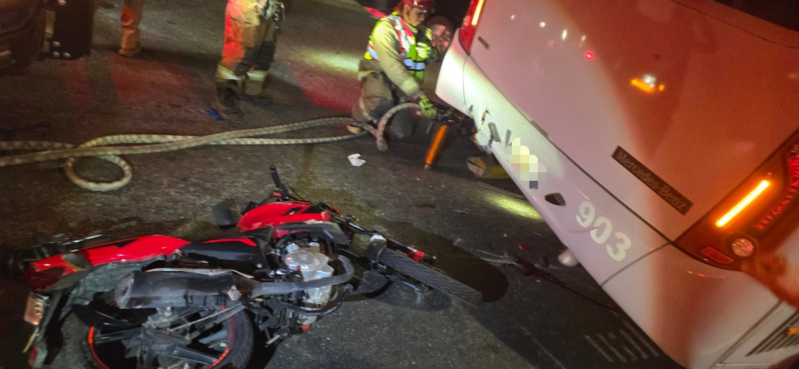 El reporte oficial señala que el motociclista, a bordo de una Italika negra con rojo, no respetó la distancia de seguridad e impactó la parte trasera del autobús Mercedes Benz gris con naranja, que transitaba en la misma dirección.