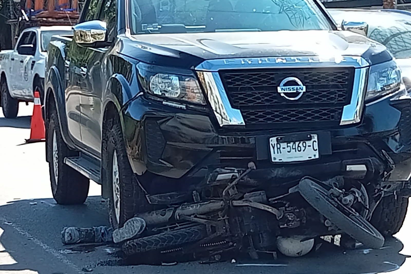 MÉRIDA, YUC.- 27 de febrero.- Debajo de una camioneta Frontier quedó el cuerpo sin vida de un motociclista luego de un terrible accidente ocurrido esta tarde en la entrada de Temozón Norte, a pocos metros del Anillo Periférico de Mérida.