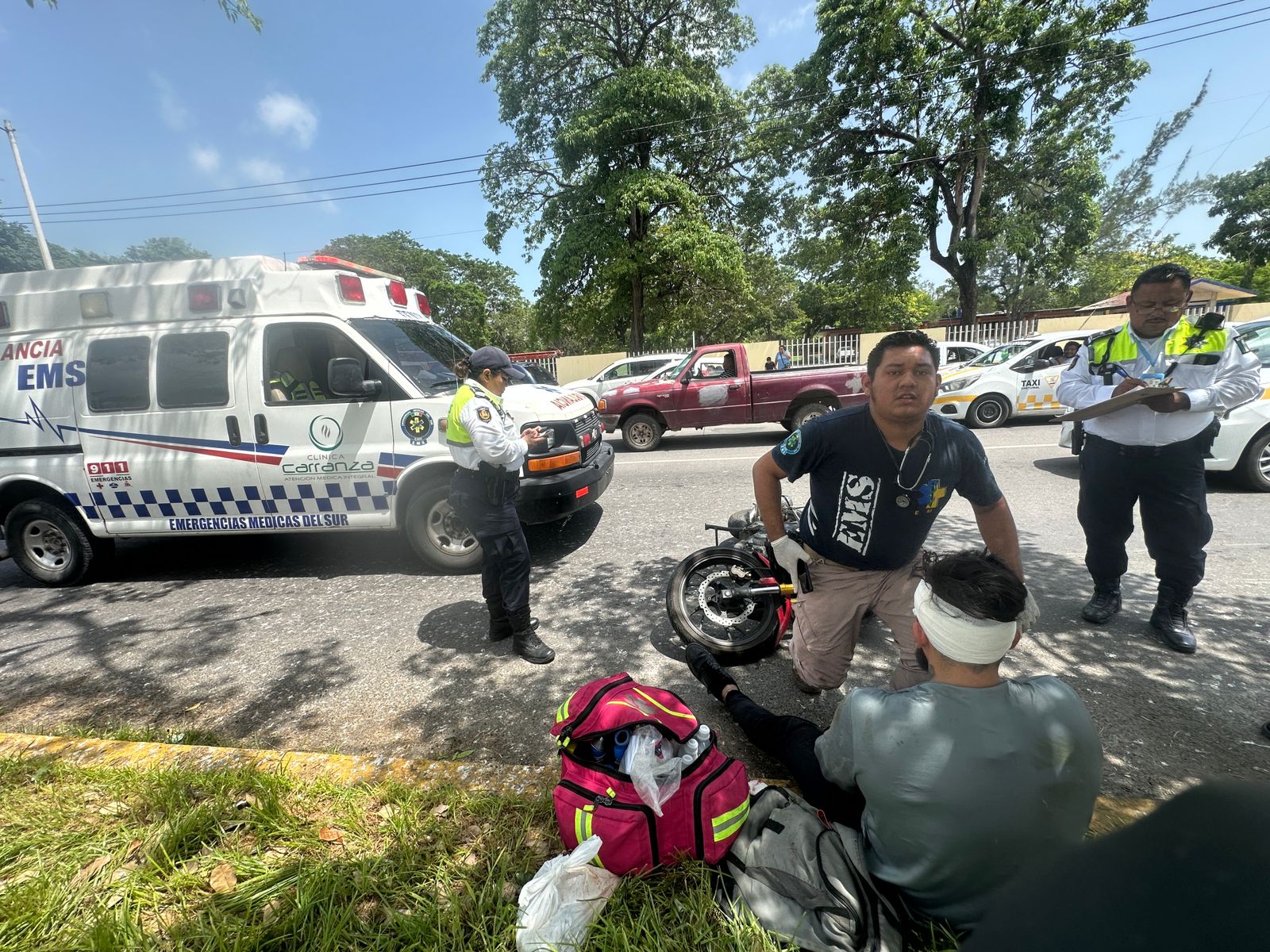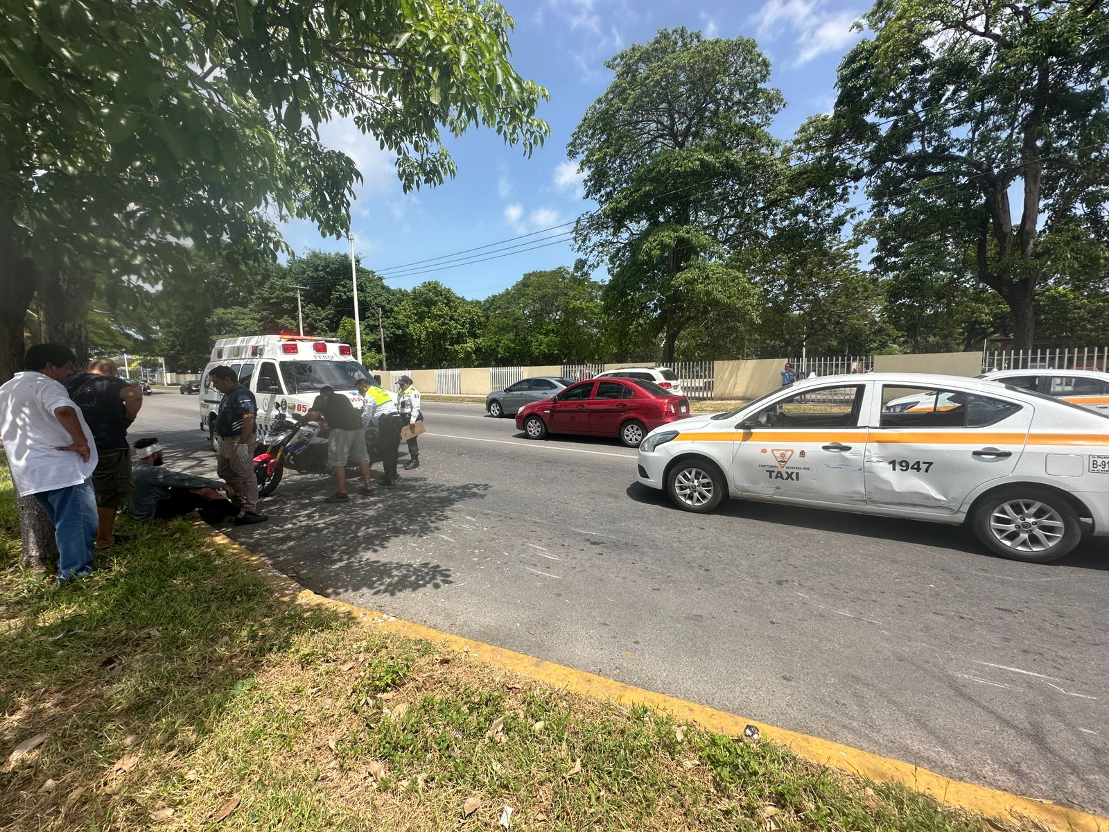 Chetumal, 9 de julio.- Se registró un aparatoso accidente vehicular en el cruce de la avenida Insurgentes con la avenida Chetumal, donde un joven motociclista terminó con una lesión en la cabeza tras impactar contra un taxi con número económico 1947.