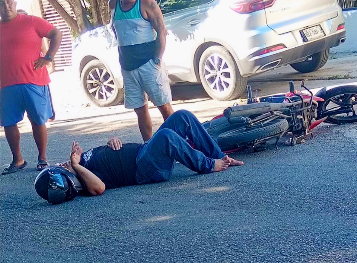 Un repartidor resultó lesionado al caer de su motocicleta tras enredarse con un cable colgante en Chetumal.