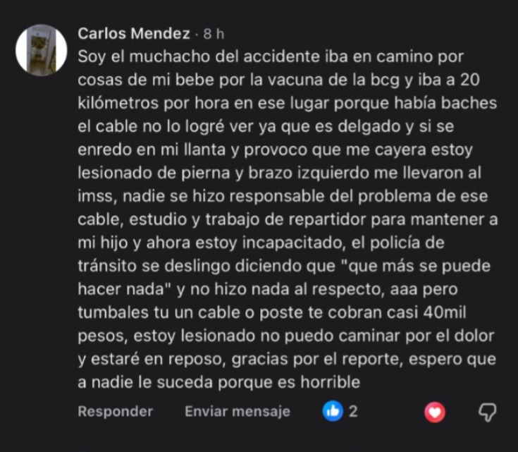 Carlos Méndez relató que el accidente ocurrió cuando se dirigía a comprar artículos para su bebé, circulando a baja velocidad debido a los baches del lugar. Sin embargo, un cable delgado que colgaba a baja altura se enredó en la llanta del vehículo, provocando que perdiera el control y cayera violentamente al pavimento.