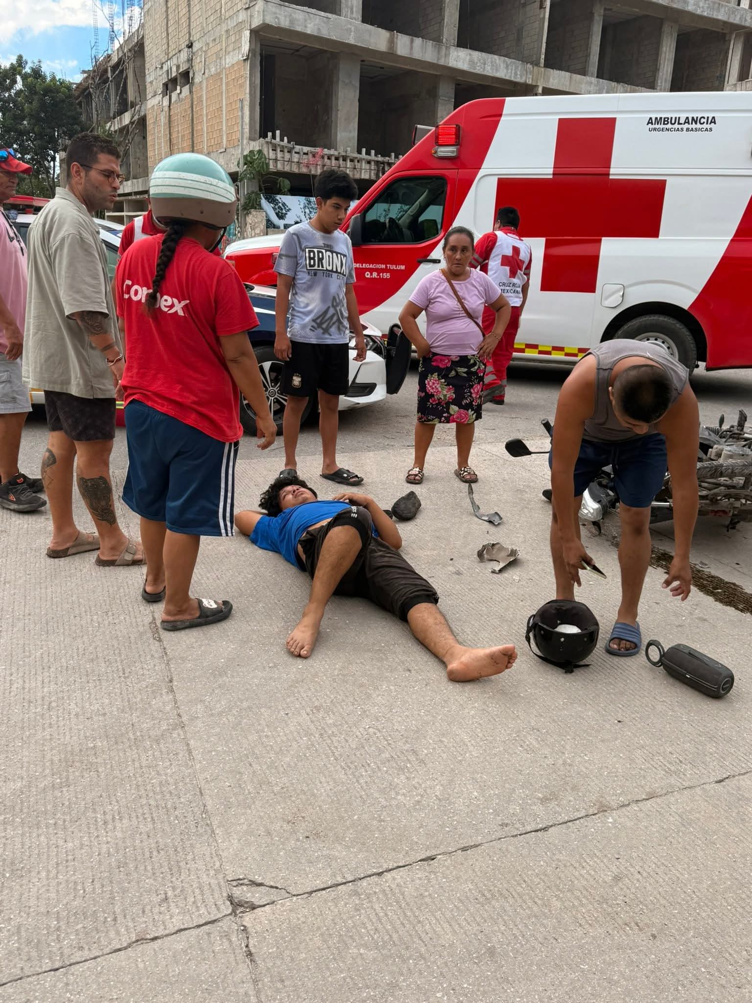 TULUM a 13 de septiembre .– Un motociclista terminó con lesiones en la cabeza y el rostro después de impactarse contra un automóvil en la intersección de la avenida Juanek con calle Alfa Sur, en el fraccionamiento Aldea Zamá.