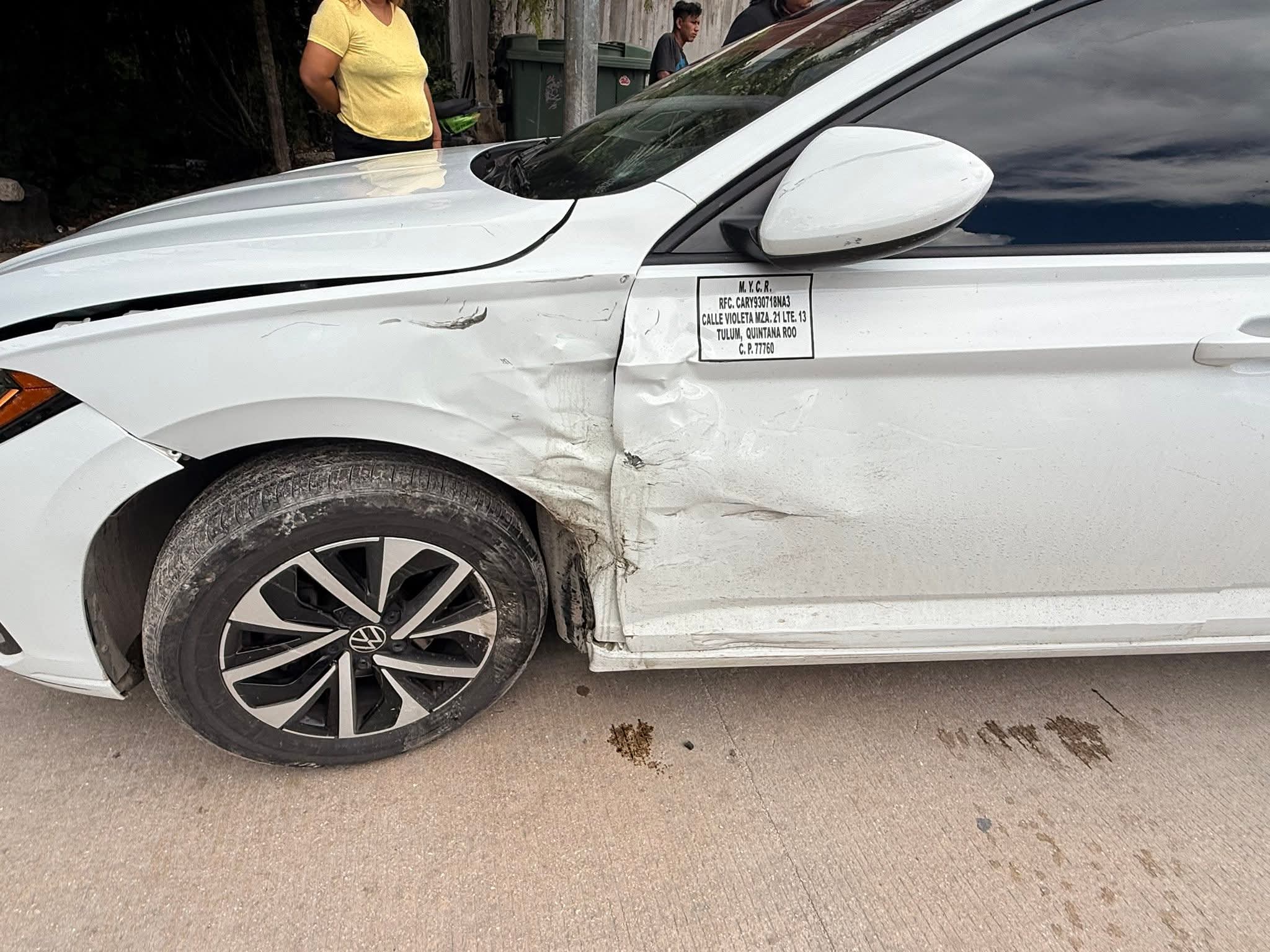 De acuerdo con los primeros reportes, la conductora de un vehículo Volkswagen Jetta blanco, propiedad de una empresa local, no respetó un señalamiento de alto, provocando que el motociclista se estrellara contra el costado izquierdo de la unidad. El golpe dejó daños visibles en la llanta delantera, el guardafangos y la puerta del conductor.