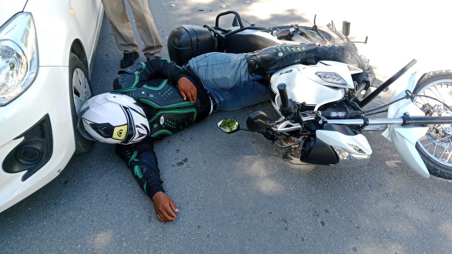 Chetumal, 5 de octubre.- Un accidente de tránsito se registró en el cruce de la Calzada del Centenario con la calle Mariano Angulo, en la colonia Santa María de Chetumal, donde un joven motociclista, empleado de una tienda Elektra, resultó con golpes y escoriaciones luego de impactarse contra un automóvil de color blanco.