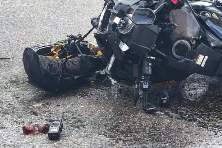 Tras el choque, la motocicleta quedó volcada y con daños totales. El elemento policial sufrió traumatismo craneoencefálico severo, fracturas bilaterales de tibia y peroné, así como fractura expuesta de cúbito y radio, por lo que fue trasladado inconsciente al Hospital El Faro.