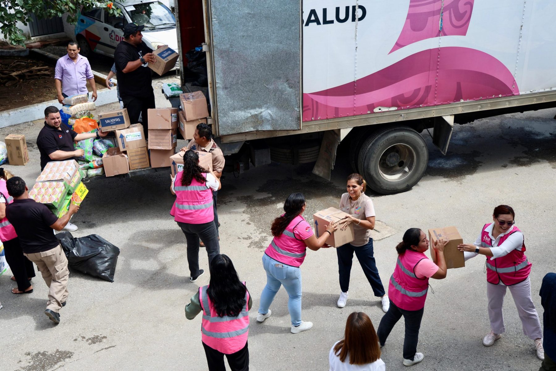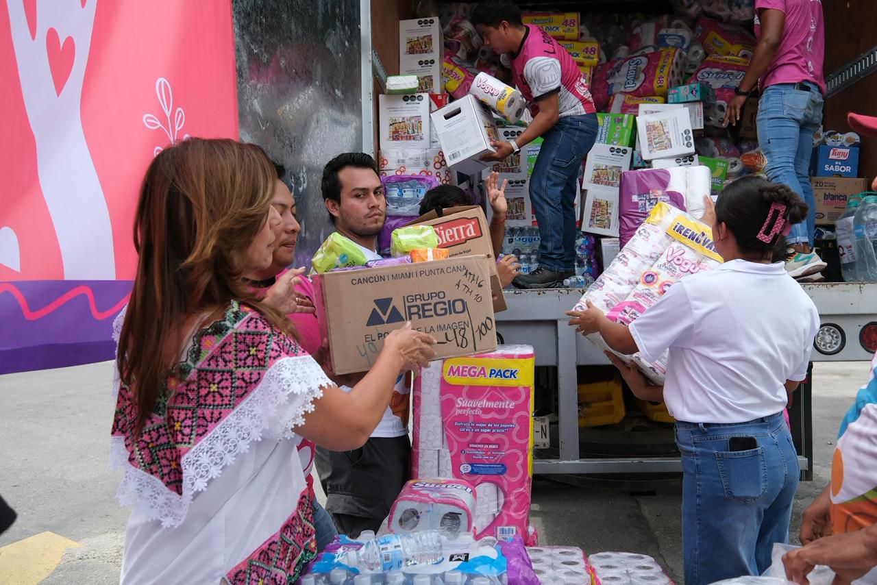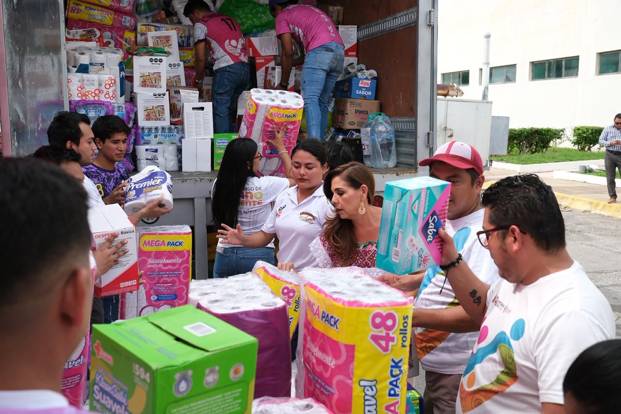 En paralelo, la Gobernadora indicó que los trabajos se realizan de manera simultánea en distintos puntos del estado: mientras su equipo opera desde Chetumal, su hermana Vero coordina las acciones en Cancún. “Gracias al apoyo de la gente, gracias al enorme corazón que tenemos en esta patria hermosa, se están enviando los camiones y se siguen llenando más”, agregó.