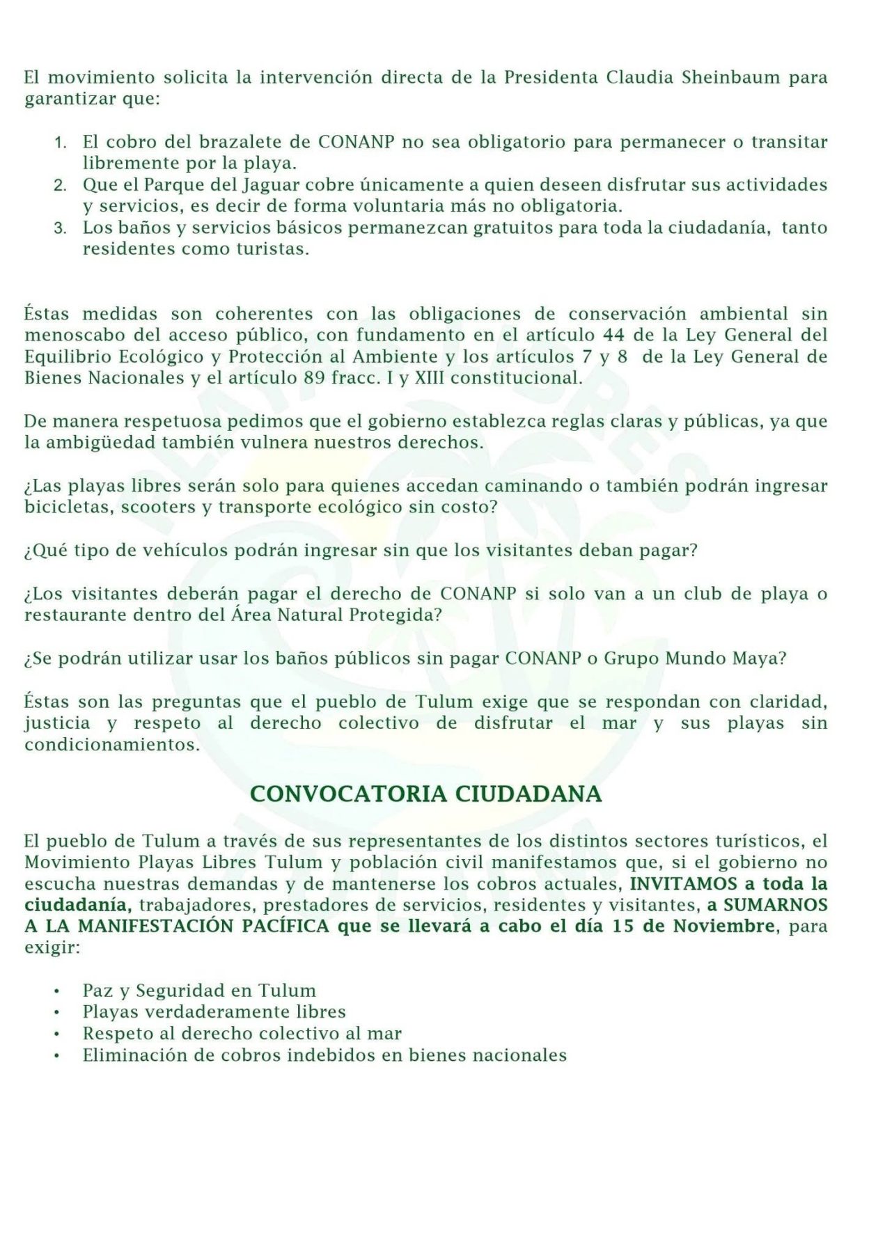 Ante este panorama, el Movimiento Playas Libres Tulum hizo un exhorto directo a la presidenta Claudia Sheinbaum Pardo para que intervenga y garantice que el cobro del brazalete de la CONANP no sea obligatorio para transitar por la playa, que el Parque del Jaguar cobre solo a quienes deseen participar en sus actividades de forma voluntaria y que los baños y servicios básicos permanezcan gratuitos para todos los visitantes.