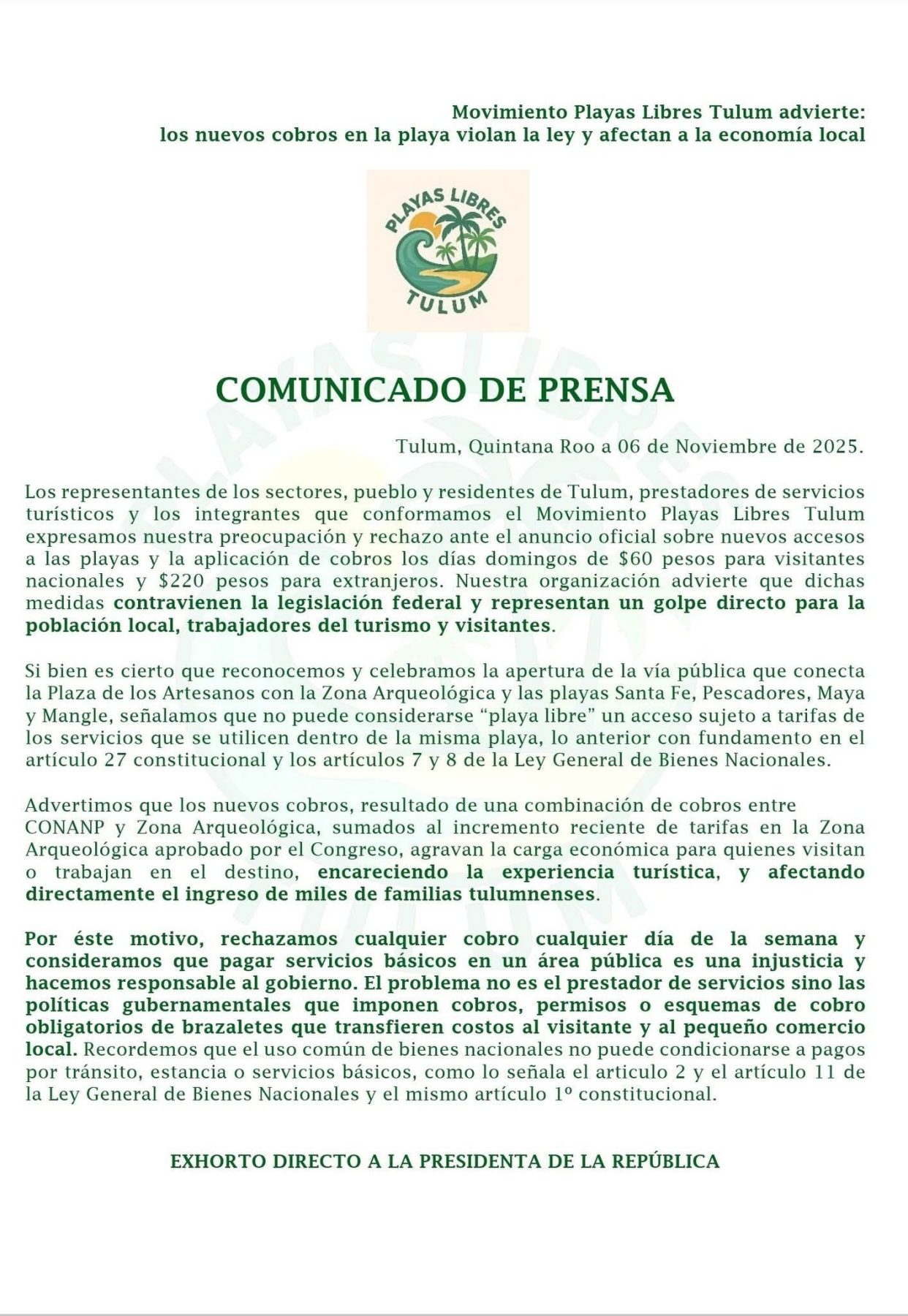 En un comunicado, el movimiento expresó que aunque reconocen la apertura del acceso público que conecta la Plaza de los Artesanos con la Zona Arqueológica y las playas Santa Fe, Pescadores, Maya y Mangle, el cobro de tarifas contradice el concepto de “playa libre”, protegido por el artículo 27 constitucional y los artículos 7 y 8 de la Ley General de Bienes Nacionales.