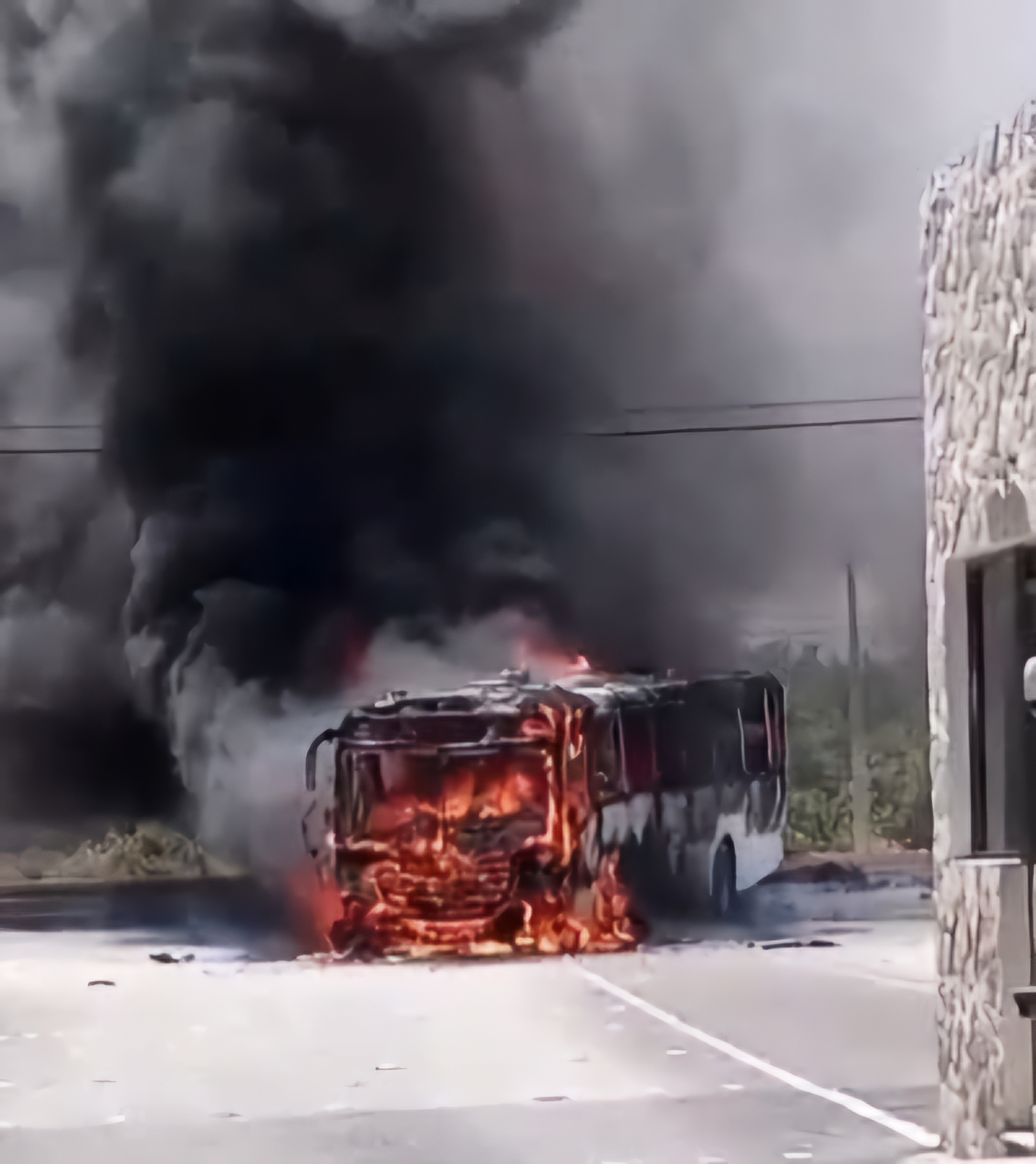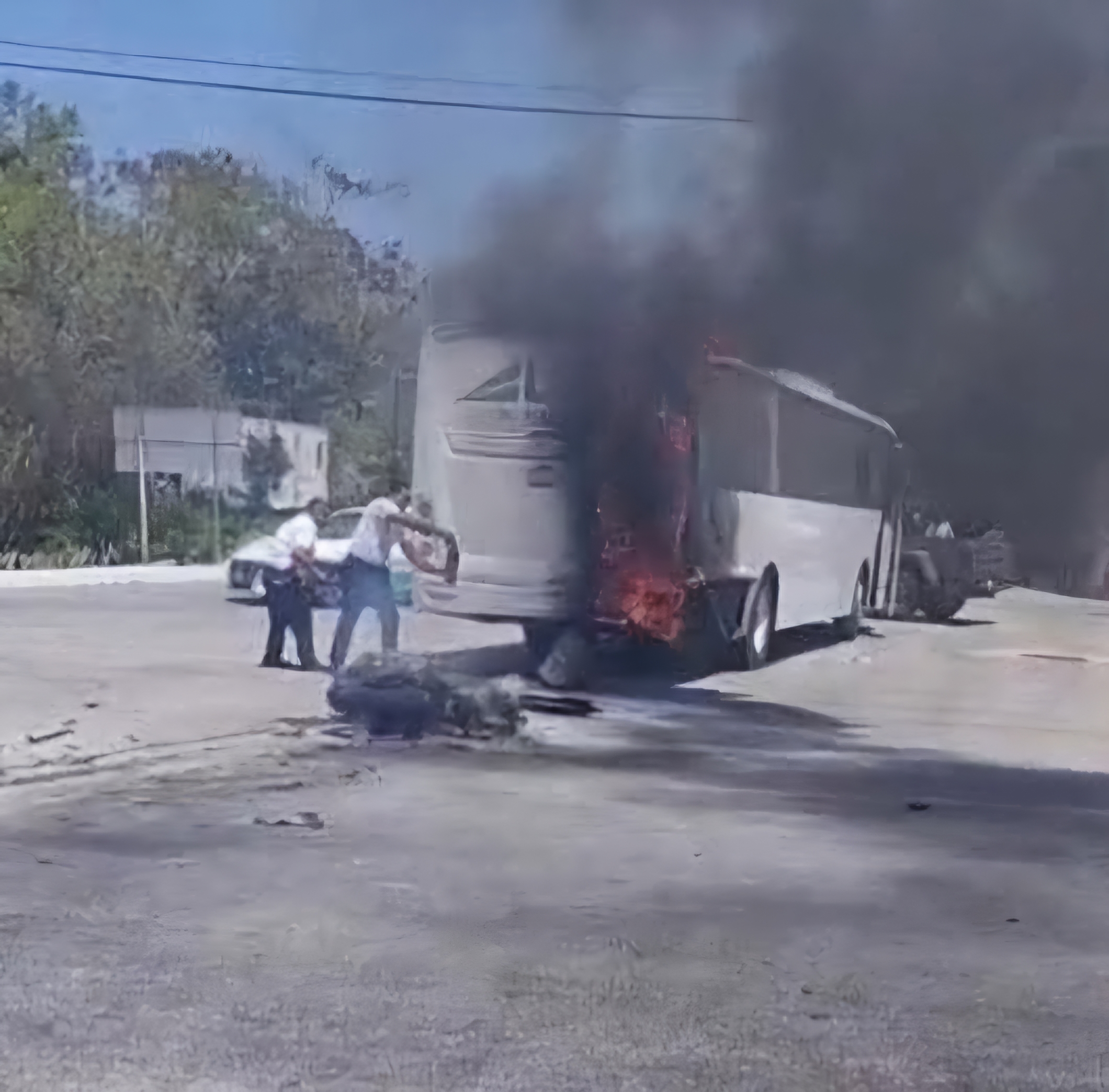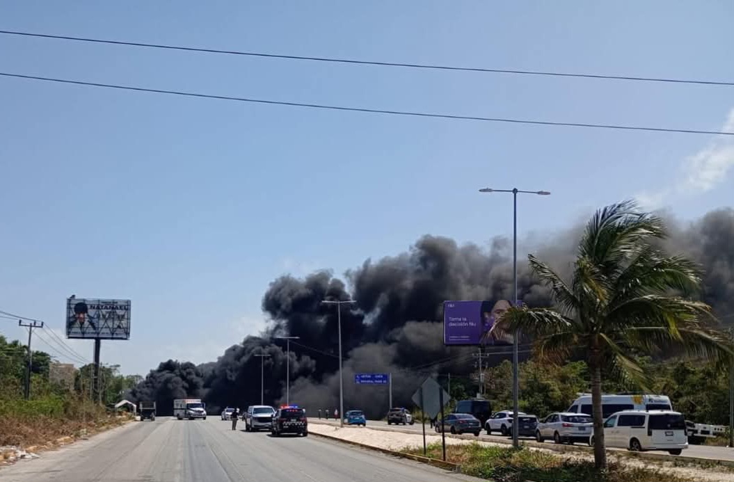 Puerto Morelos, a 25 de abril de 2025.- Motociclista pierde la vida al estrellarse en la parte trasera de un autobús de transporte de personal sobre la Carretera Federal 307 en el tramo entre Puerto Morelos y Cancún, a la altura del acceso al Hotel Royalton Splash. Del impacto termina incendiandose el autobús que afortunadamente iba vacio.