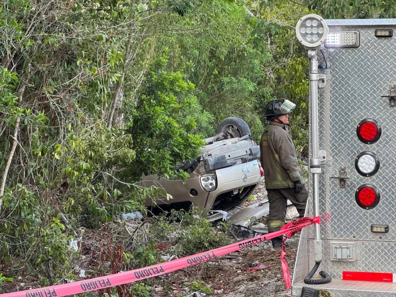El hecho se registró en la carretera Químico Pastrana, vialidad que conecta las avenidas Kabah y Rancho Viejo, cuando un automóvil Chevy, color dorado, terminó fuera del camino tras volcarse violentamente.