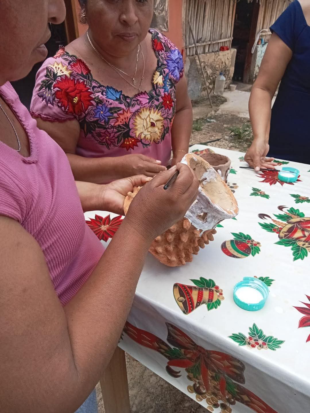 Asimismo, dentro de las actividades del taller se ha retomado el uso de pigmentos naturales para la decoración de las piezas, aplicados mediante técnicas tradicionales que permiten reproducir elementos de la iconografía maya, lo que contribuye a recuperar conocimientos transmitidos de generación en generación.