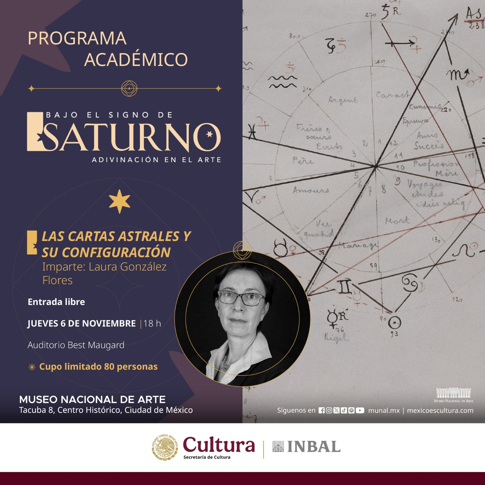 En el marco de la exposición Bajo el signo de Saturno. Adivinación en el arte, que presenta el Museo Nacional de Arte (MUNAL), recinto del Instituto Nacional de Bellas Artes y Literatura (INBAL), la investigadora Laura González ofrecerá la conferencia Mapas astrales, configuraciones imaginarias, en la que explorará la relación entre el arte y la astrología, uno de los saberes más antiguos con los que el ser humano ha buscado comprenderse. La actividad se llevará a cabo hoy, 6 de noviembre, a las 18 horas, con entrada libre.