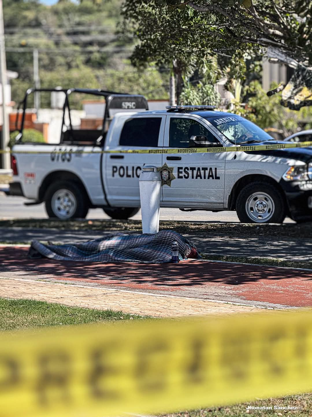 Elementos de la Policía Estatal (PE) acordonaron la zona para la llegada de los integrantes de la Agencia Estatal de Investigaciones (AEI), del Instituto de Servicios Periciales y del Servicio Médico Forense (SEMEFO).