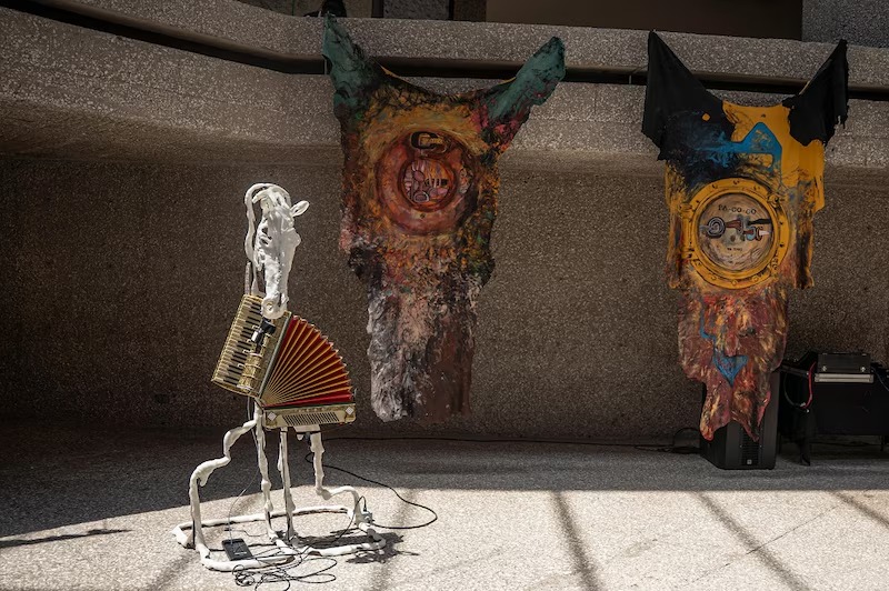 Además, se encuentra una instalación realizada con piezas de rastrillos cosechadores, los cuales fueron comprados a través de internet con la finalidad de reutilizarlos y exhibirlos fuera de su función tradicional.