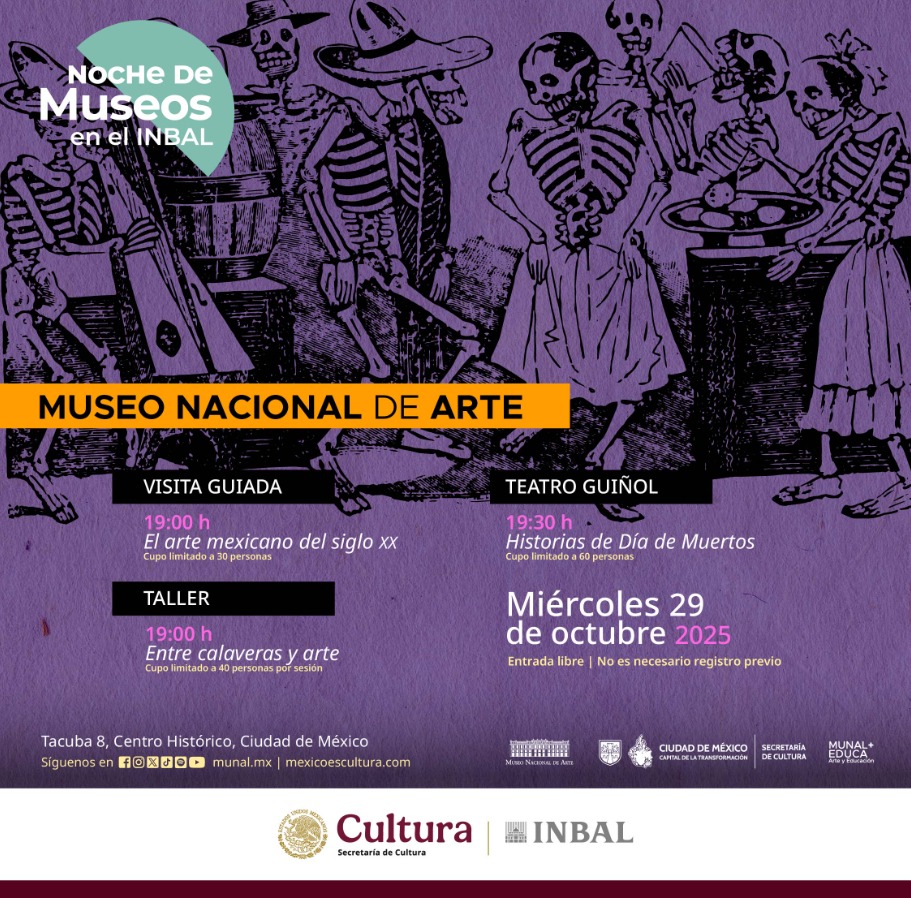 El Museo Nacional de Arte (MUNAL) dedicará su altar del Día de Muertos a los artistas cuyas obras forman parte de la colección del museo. Además, durante la inauguración, el 29 de octubre a las 19:30 horas, en el contexto de la Noche de Museos, se realizará una instalación colectiva en la que los asistentes podrán dejar un mensaje a sus difuntos. La ofrenda se podrá visitar hasta el 2 de noviembre.