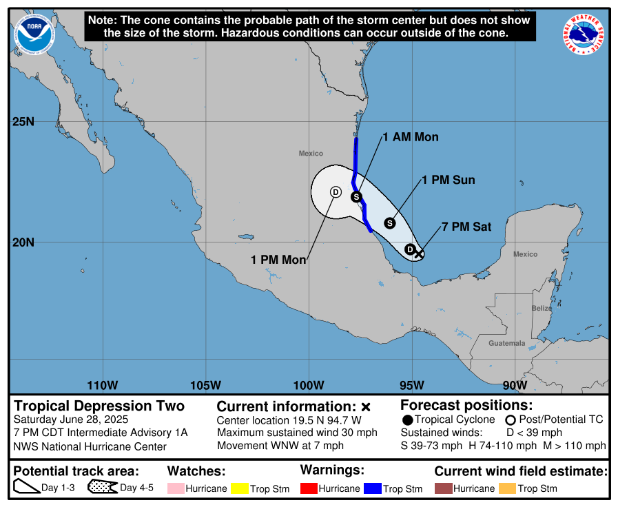 El Centro Nacional de Huracanes de Estados Unidos (CNH) indicó que se espera que la depresión tropical se vuelva tormenta tropical el domingo antes de tocar tierra en la costa oriental de México y se mueva hacia el interior del territorio hasta debilitarse y disiparse.