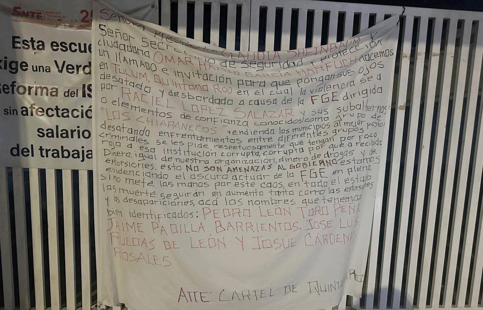 Firmado presuntamente por el Cártel de Quintana Roo, el texto señala directamente al fiscal Raciel López Salazar y a un grupo de sus colaboradores, a quienes acusa de recibir dinero proveniente de extorsiones y del narcotráfico.