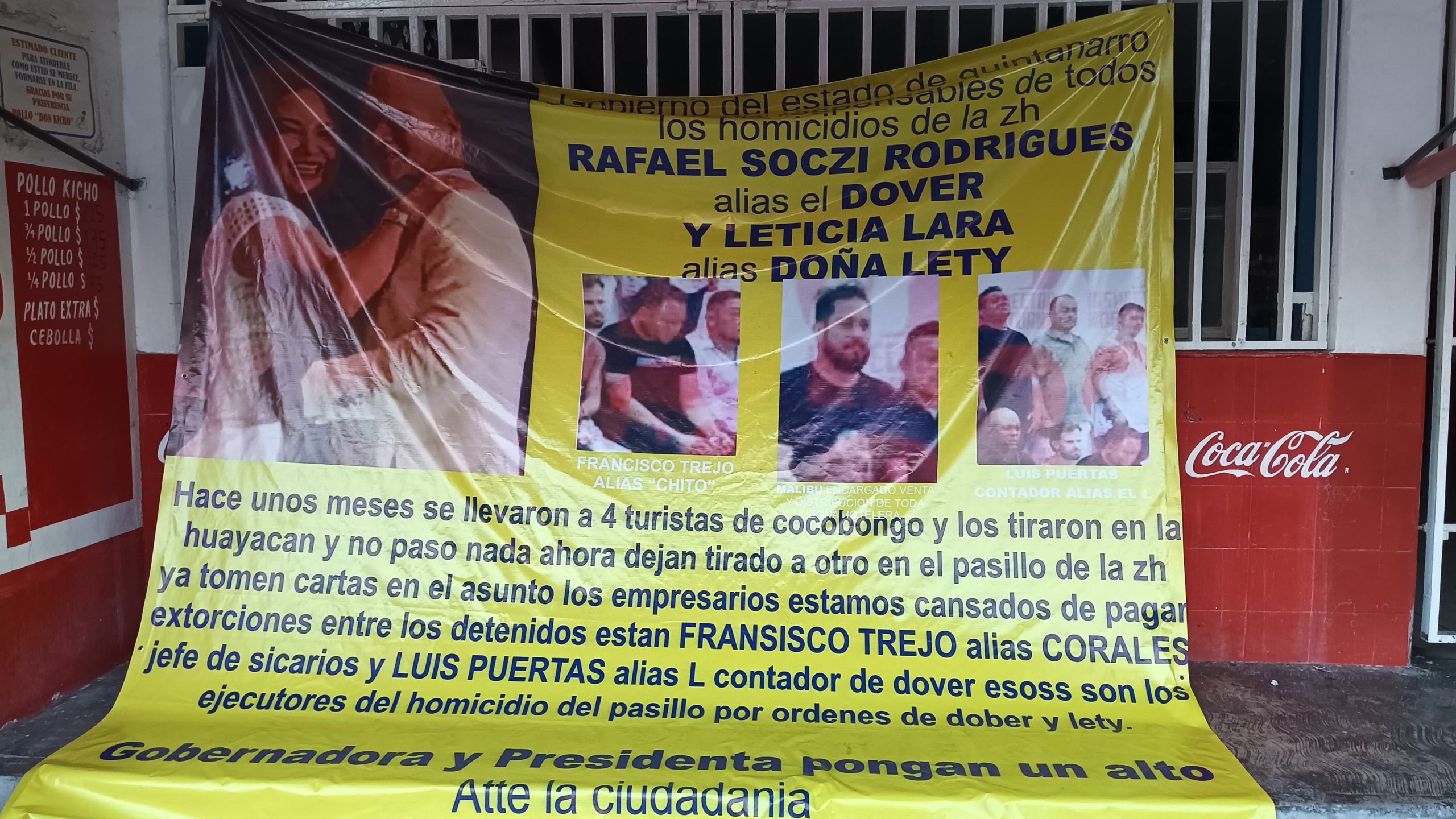 El mensaje, escrito con letras negras sobre una lona amarilla, señala a “El Dover” y a “Doña Lety Lara” como responsables de los recientes hechos violentos registrados en la zona hotelera el pasado sábado 10 de mayo. La manta, firmada presuntamente por un grupo de empresarios que aseguran estar hartos de ser víctimas de extorsiones y cobros de derecho de piso, fue descubierta alrededor de las 7:30 horas de la mañana, luego de que una llamada anónima al 911 alertara sobre su presencia.