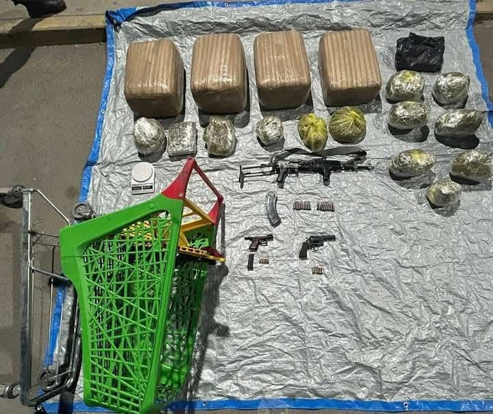 Fuerza civil arresta a presuntos criminales que usaban un carrito de supermercado para transportar marihuana, báscula y arsenal en colonia el palmar, monterrey