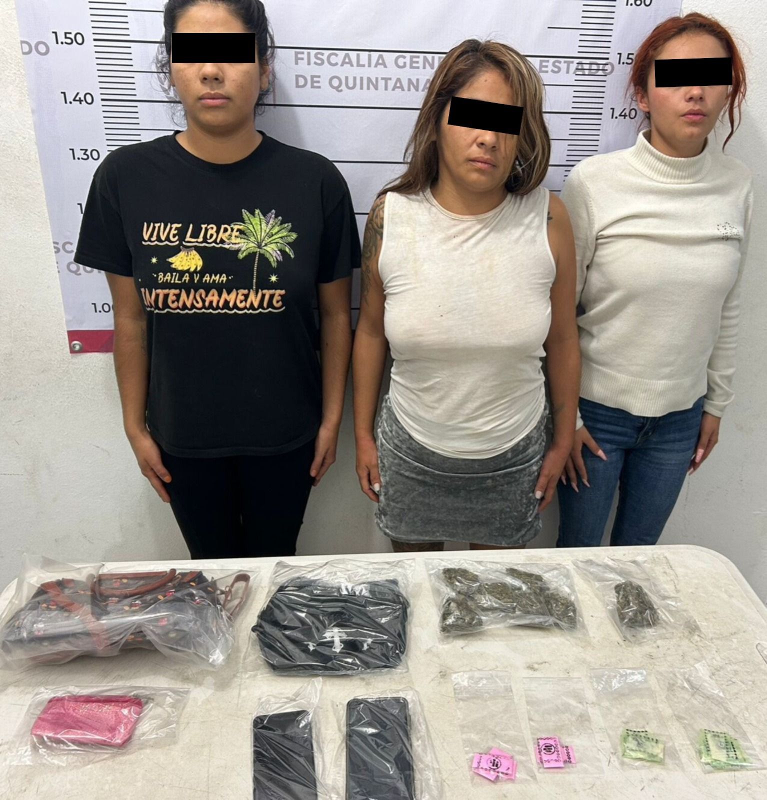 Tres mujeres detenidas con “todo el menú” de drogas. En una primera intervención sobre la calle Sol Poniente y Júpiter Sur, agentes interceptaron a Emma Marina “N”, Sofía “N” y Laura Angélica “N”, quienes fueron sorprendidas con marihuana, cristal, cocaína y celulares usados —según la investigación— para coordinar la distribución de droga.