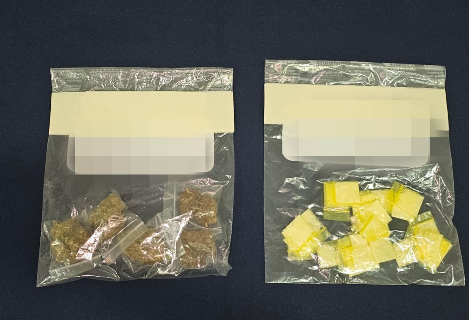 Durante la revisión, las autoridades aseguraron: 5 bolsitas tipo ziploc con hierba seca y verde, similar a la marihuana, 37 bolsitas ziploc con polvo blanco, presuntamente cocaína.