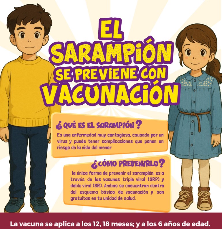 La primera dosis SRP se aplica a los 12 meses y la segunda a los 18 meses de edad, además de que las niñas y los niños nacidos antes de julio de 2020 deben recibir una dosis adicional a los seis años, esquema vigente hasta 2026.