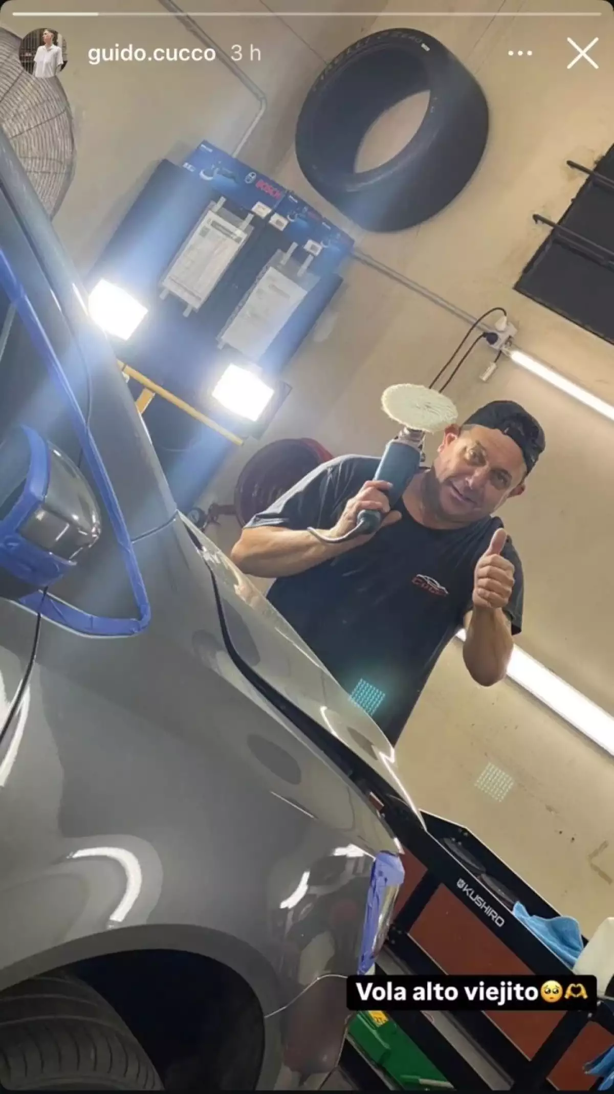 A través de sus historias de Instagram, el joven compartió una foto de su padre, Sergio, sonriendo y mostrando el pulgar hacia arriba mientras trabajaba en su taller mecánico.