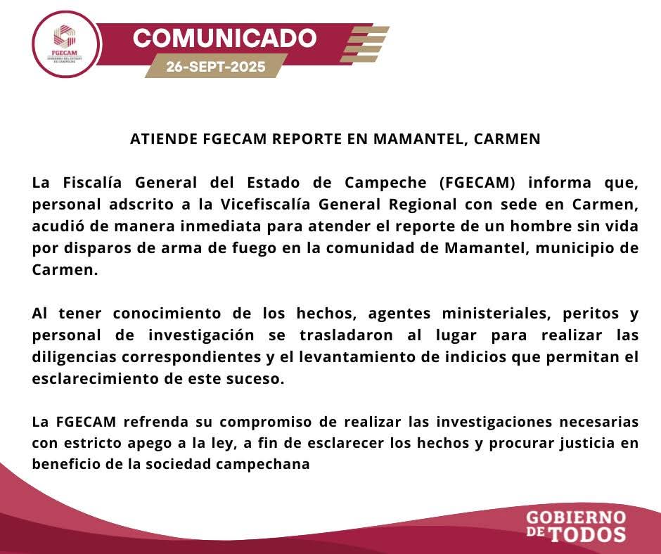 San Francisco de Campeche, Cam., 26 de septiembre.- En contraposición con los informes alegres de la Gobernadora Layda Sansores Sanromán, la Fiscalía General del Estado de Campeche (FGECAM), dio a conocer este viernes el hallazgo de una persona sin vida en la Comisaría de Mamantel, correspondiente al municipio del Carmen.
