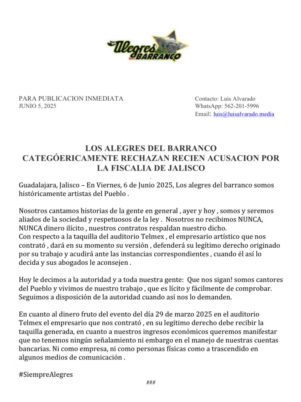 Los Alegres del Barranco reaccionaron a los señalamientos de la Fiscalía de Jalisco en su contra a través de un comunicado publicado en sus redes sociales, donde negaron que el dinero que reciben sea de manera ilícita.