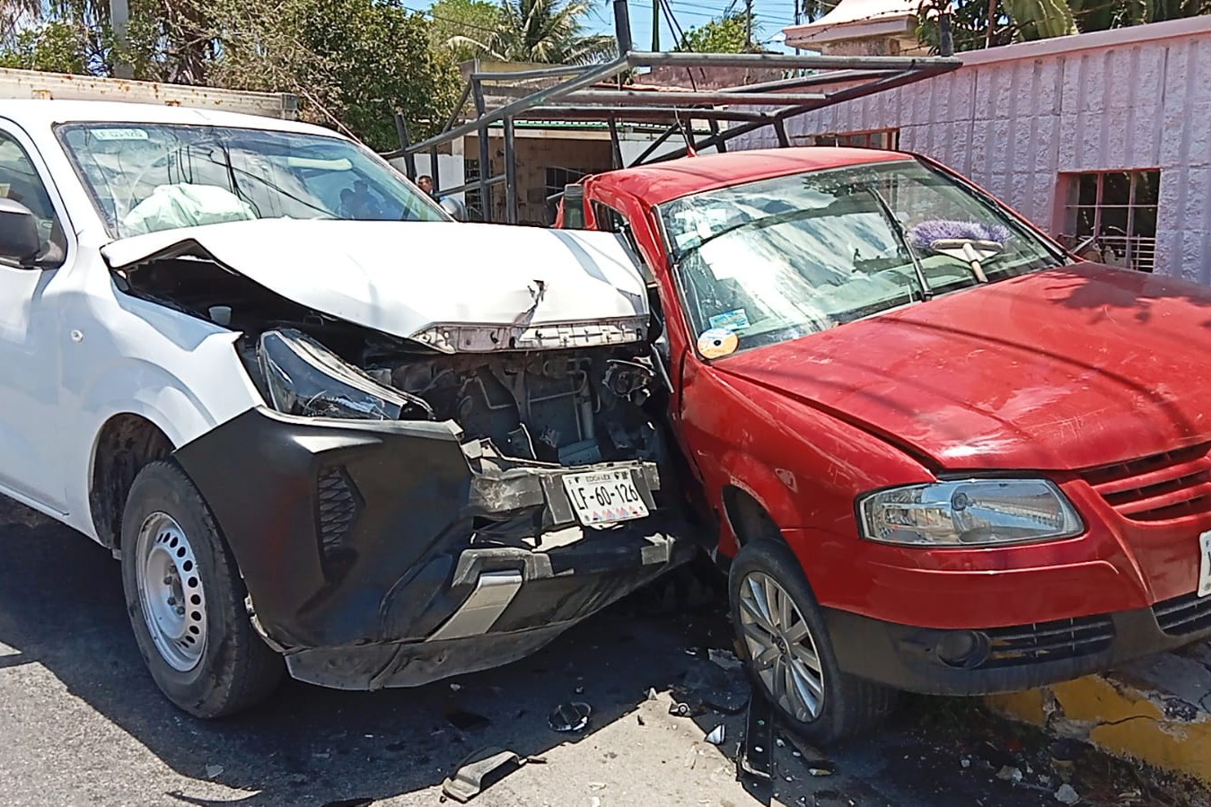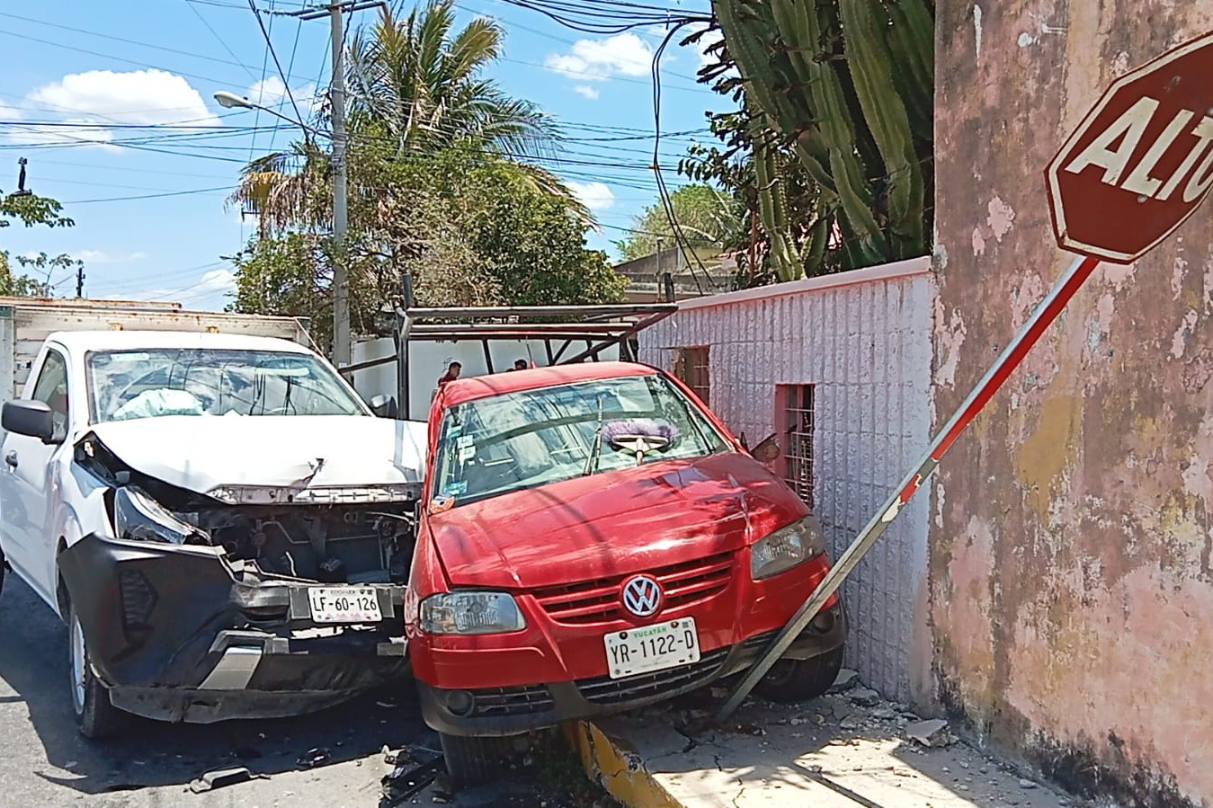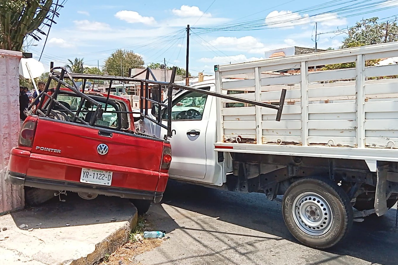 MÉRIDA, YUC.- 8 de mayo.- El conductor de una camioneta tipo Pointer iba transitando sobre la calle 54 al sur de la ciudad de Mérida en la Colonia Mercedes Barrera al llegar al cruce con 115 dicha Colonia el conductor de la camioneta tipo Pointer se pasó el alto de disco ocasionando que una camioneta de redilas Nissan se le impacte de costado donde va el copiloto por el impacto la empujó hasta chocar y prensarla contra la fachada de una casa ubicada en dicha esquina.
