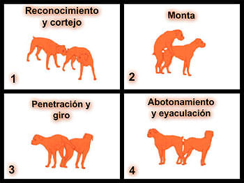 Durante la monta, se inicia la fase de copulación, en la cual el macho introduce su pene en la vagina, este tiene un hueso que le permite tener rigidez y penetrar a la perra antes de la erección; en la base del pene hay un área llamada el bulbo del glande, el cual recibe mucha sangre y aumenta su tamaño dentro de la vagina y la hembra tiene un anillo fibromuscular de tamaño reducido, el cual impide que el pene se salga del canal vaginal.