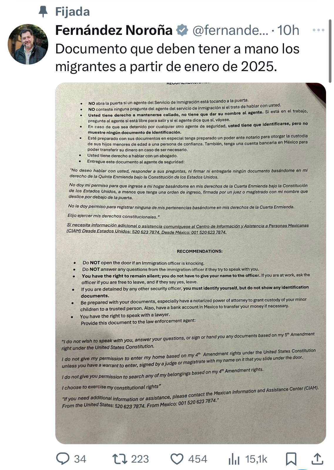 El presidente de la Mesa Directiva del Senado de la República, el petista Gerardo Fernández Noroña, difundió en sus redes sociales un documento con recomendaciones para los migrantes mexicanos en Estados Unidos, toda vez que asuma la presidencia de ese país el republicano Donald Trump, el próximo 20 de enero.