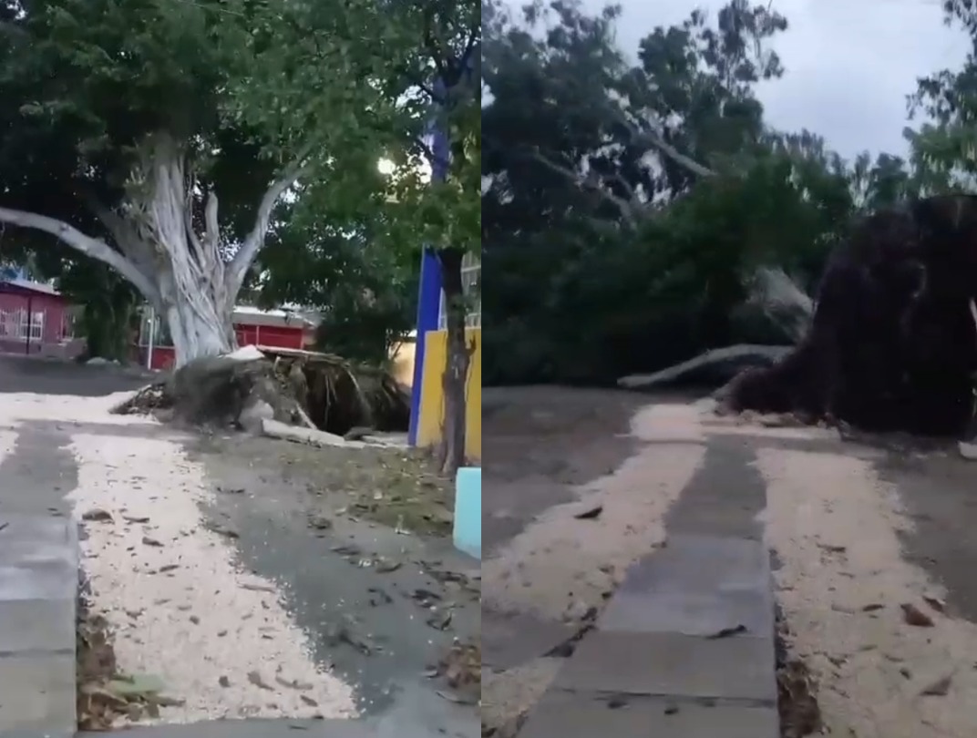 Uno de los casos fue registrado en el andador del Fraccionamiento Fovissste, en donde los vecinos grabaron el momento exacto en que un árbol de gran tamaño sucumbió ante los fuertes vientos.