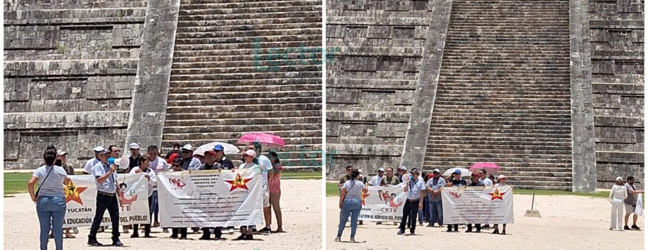 Pisté, Yucatán.- Después de poco más de tres semanas que levantaron su paro de labores educativas de casi un mes, líderes de la Coordinadora Nacional de Trabajadores de la Educación (CNTE) se manifestaron este domingo dentro de la zona arqueológica de Chichén Itzá.