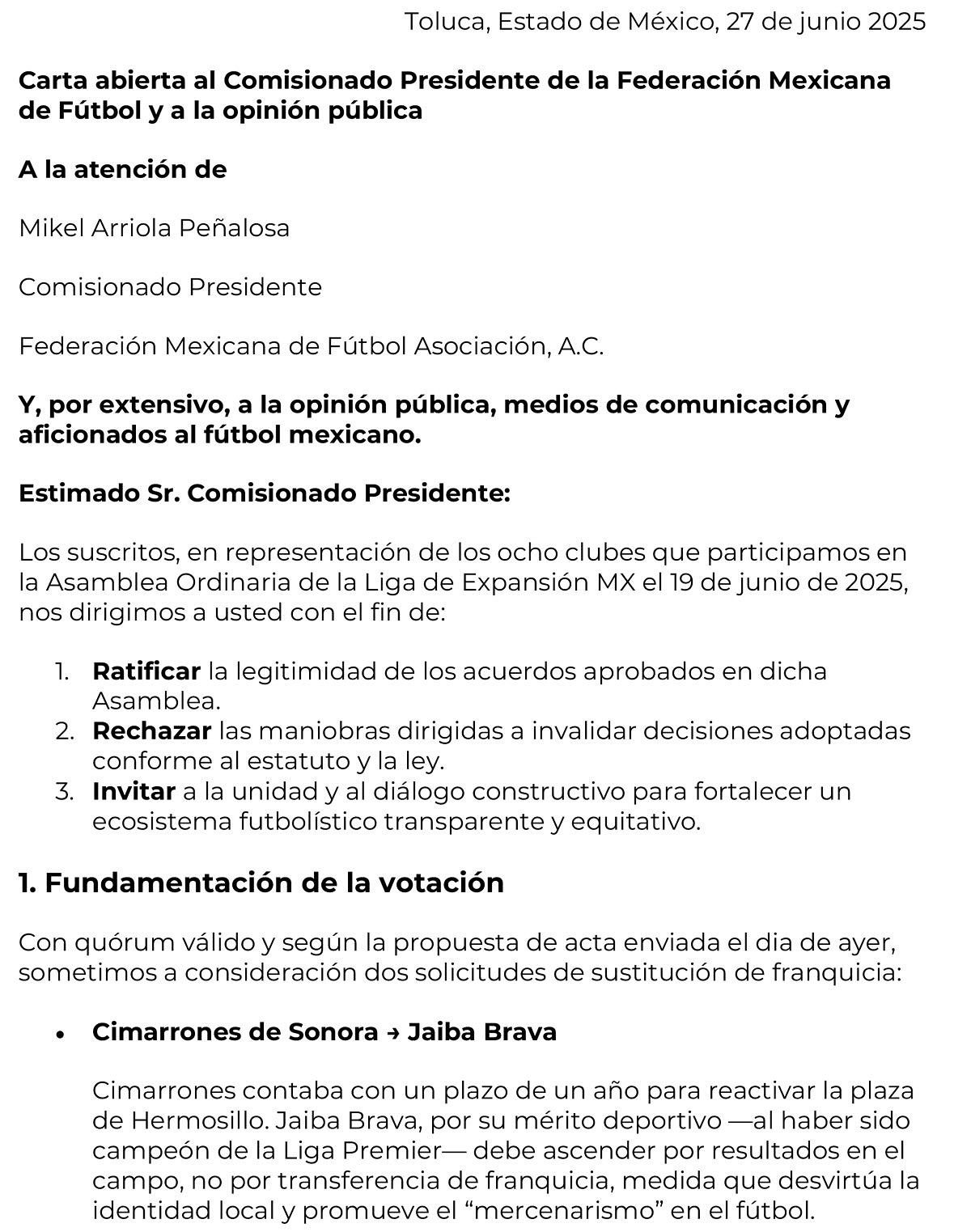 Los clubes de la Liga de Expansión que abrieron un procedimiento ante el Tribunal de Arbitraje Deportivo (TAS, por sus siglas en inglés) para el restablecimiento del sistema de ascensos y descensos en el futbol mexicano, exigieron a la Federación Mexicana de Futbol (FMF) el cese de interpretaciones arbitrarias como el desconocimiento de acuerdos, fomento de favoritismos contrarios al principio del mérito deportivo y maniobras dirigidas a invalidar decisiones adoptadas conforme a la ley, luego de la asamblea ordinaria realizada el 19 de junio en la que se acordó no autorizar el cambio de franquicias de Cimarrones de Sonora y Celaya FC.