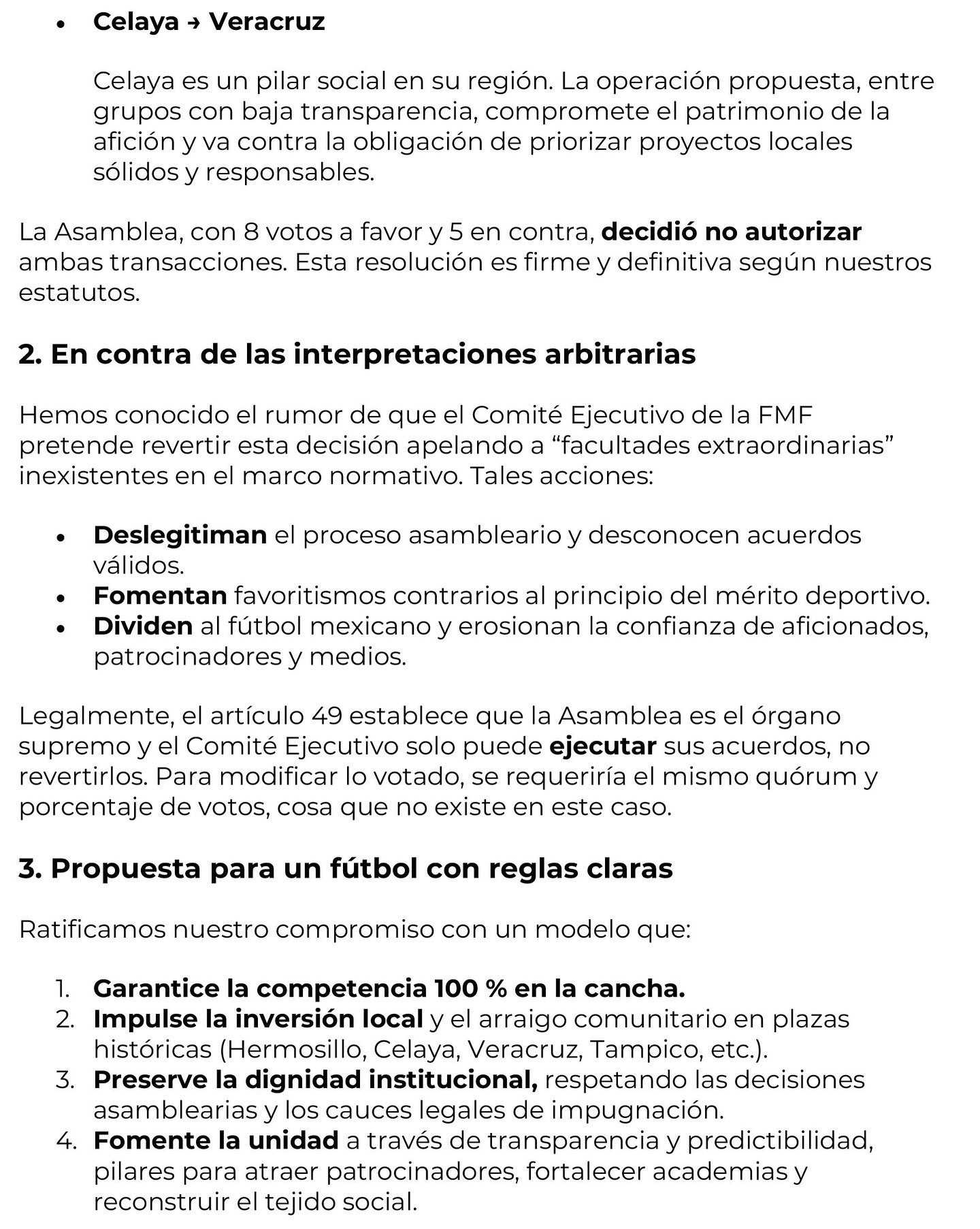 En un documento firmado por Atlético Morelia, Leones Negros, Venados FC, Atlético La Paz, Tepatitlán, Mineros de Zacatecas y Cancún FC, los representantes de la segunda división alertaron sobre un posible intento del Comité Ejecutivo de la FMF de revertir la resolución del proceso asambleario mediante “facultades extraordinarias inexistentes” en el marco normativo, argumentaron.