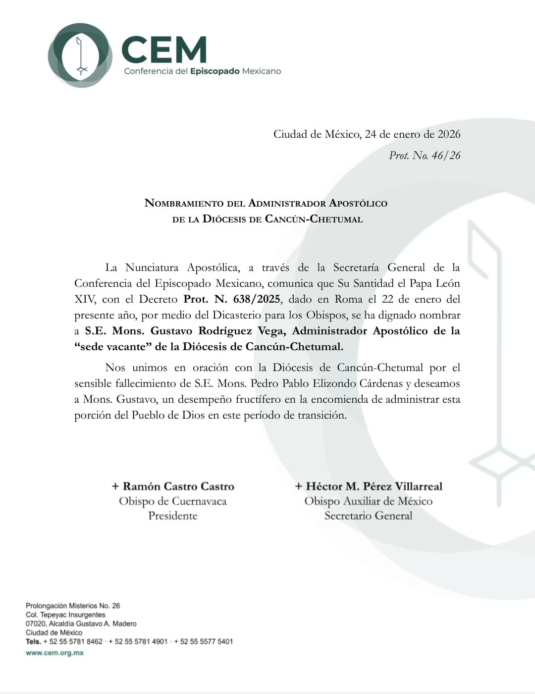 Está tarde la Nunciatura Apostólica en México, a través de la Secretaría General de la Conferencia del Episcopado Mexicano, comunica que Su Santidad el Papa León XIV , a través del Decreto Prot. N. 638/2025*, dado en Roma el 22 de enero del presente año, por medio del Dicasterio para los Obispos, se ha dignado nombrar a S.E. Mons. Gustavo Rodríguez Vega, *Administrador Apostólico de la “sede vacante” de la Diócesis de Cancún-Chetumal.