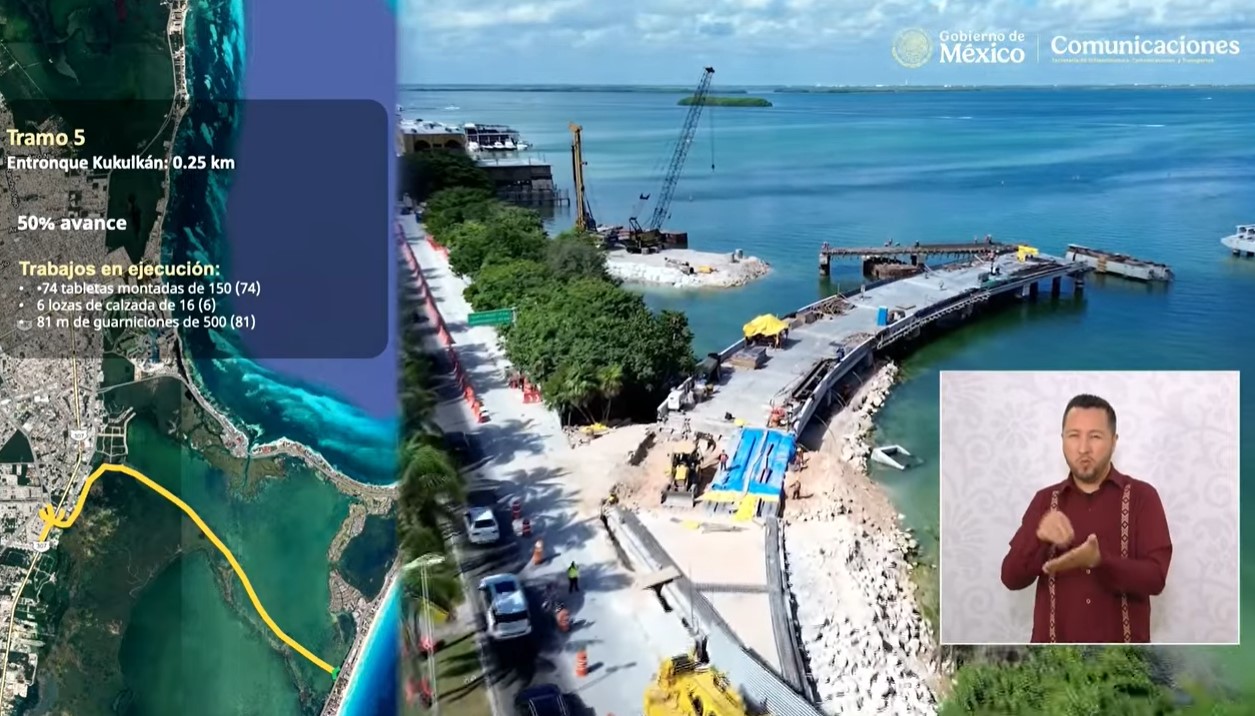 La última etapa, que es el tramo 5, correspondiente al entronque Kukulkán, tiene avance del 50 %, donde equipos trabajan en el montaje de tabletas, con 11 mil de un total de 32 mil.