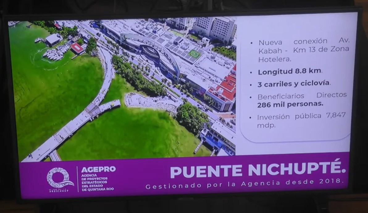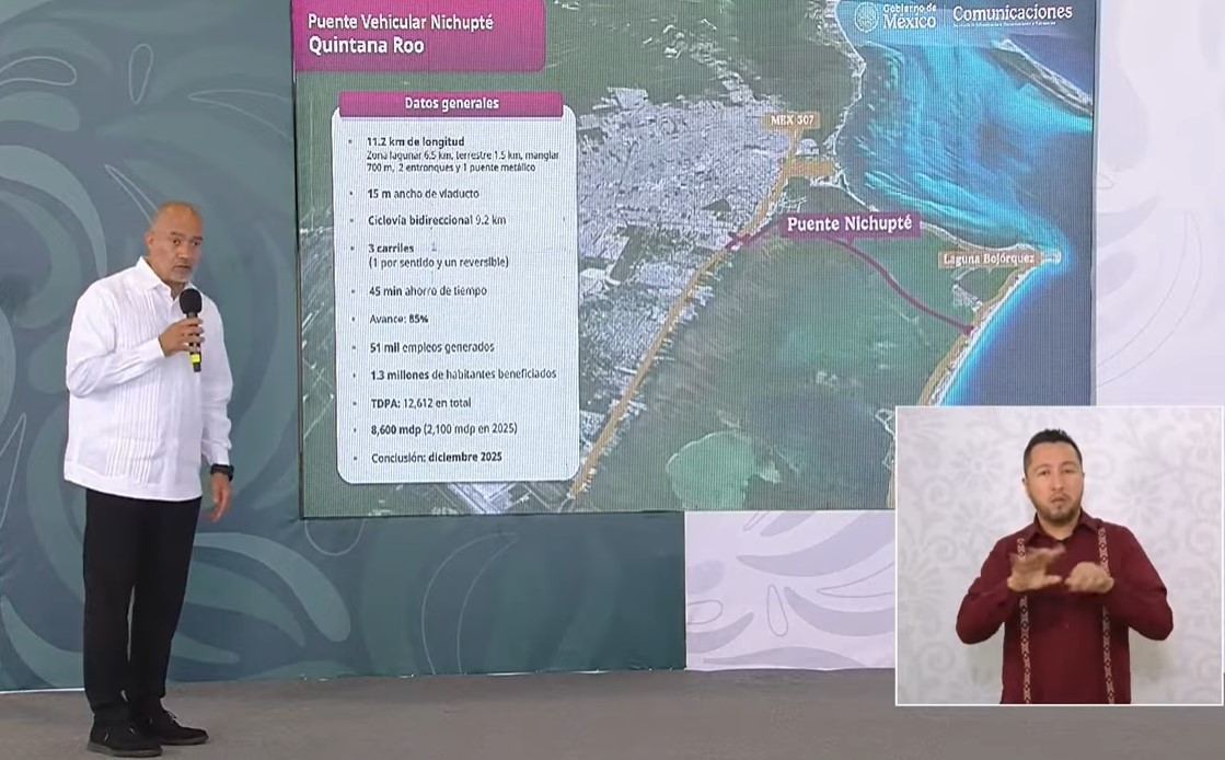 “En cuanto a su conclusión, la intención es que termine el año que viene y esperamos la fecha definida de la misma”, afirmó, en reconocimiento de que no se cumplirá la meta de inaugurar el puente sobre la laguna Nichupté antes de la Navidad de este 2025.