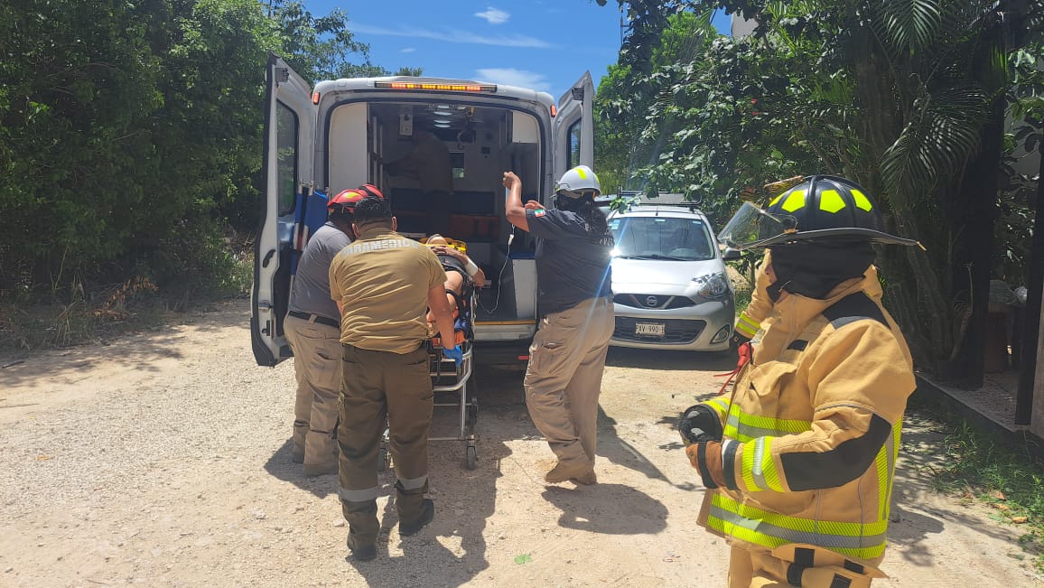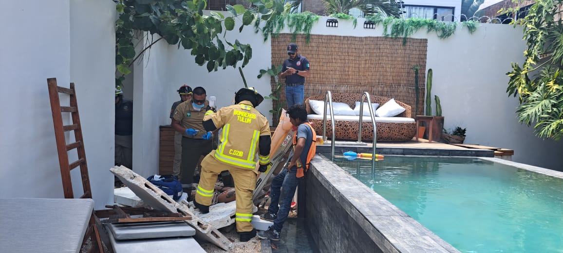 TULUM a 26 de agosto.— Un grave accidente en una obra en construcción de la zona de La Veleta dejó como saldo un hombre de 34 años lesionado, luego de que un muro de aproximadamente una tonelada colapsara sobre él. El hecho ocurrió en el complejo T Zunun, ubicado en la calle 9 con 16 Sur.