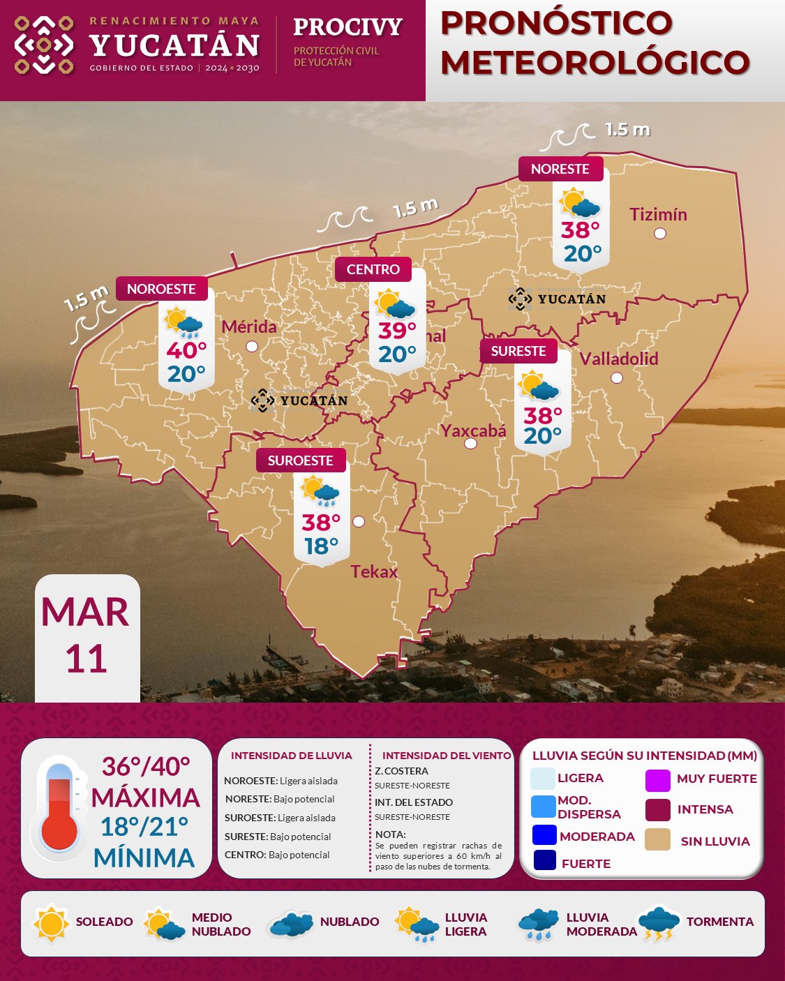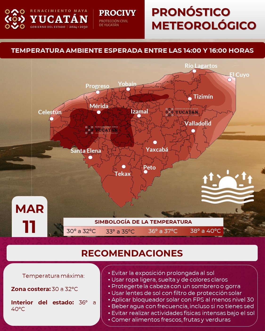 • Sistema de alta presión y humedad en la península provocarán ambiente extremadamente caluroso este 11 de marzo, con temperaturas de hasta 40 grados en Mérida y municipios del interior