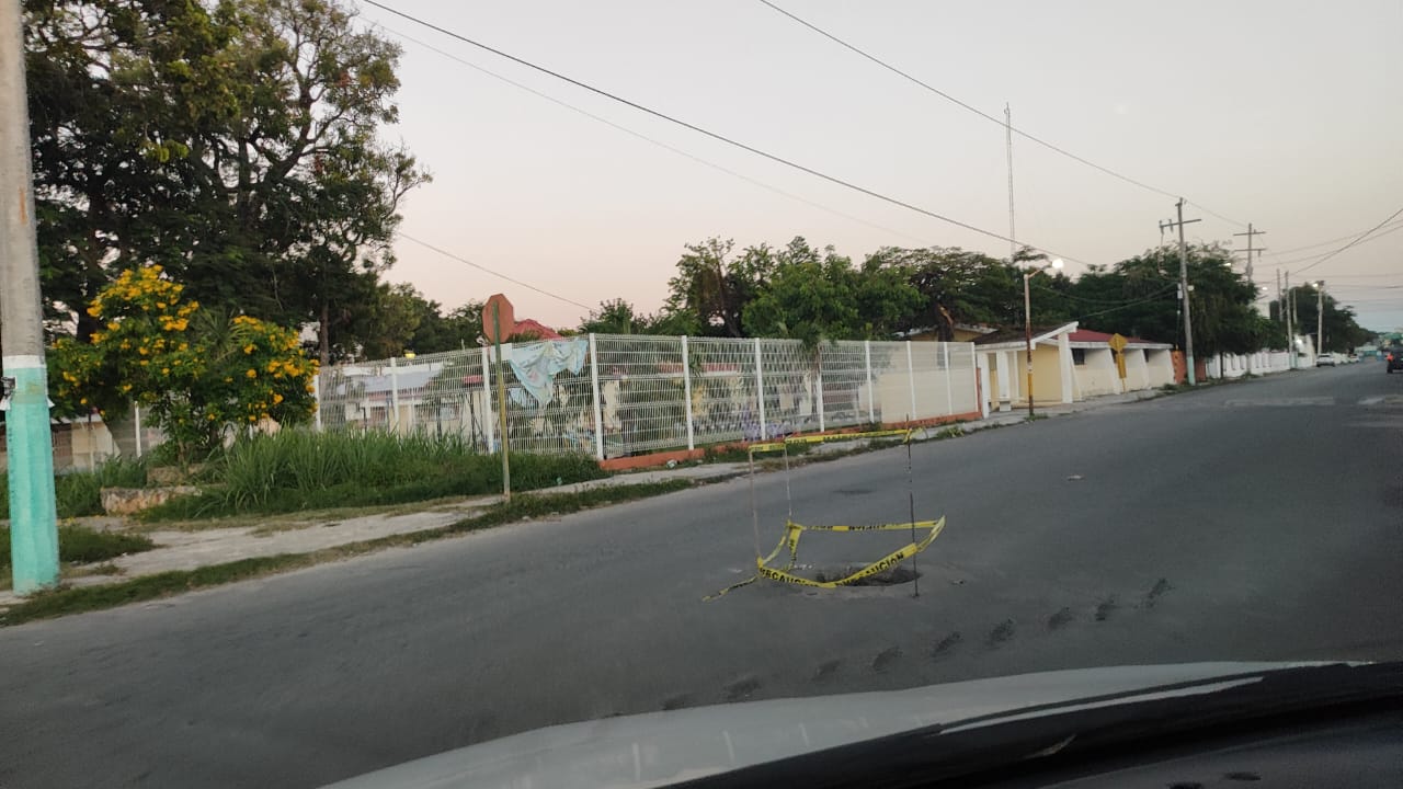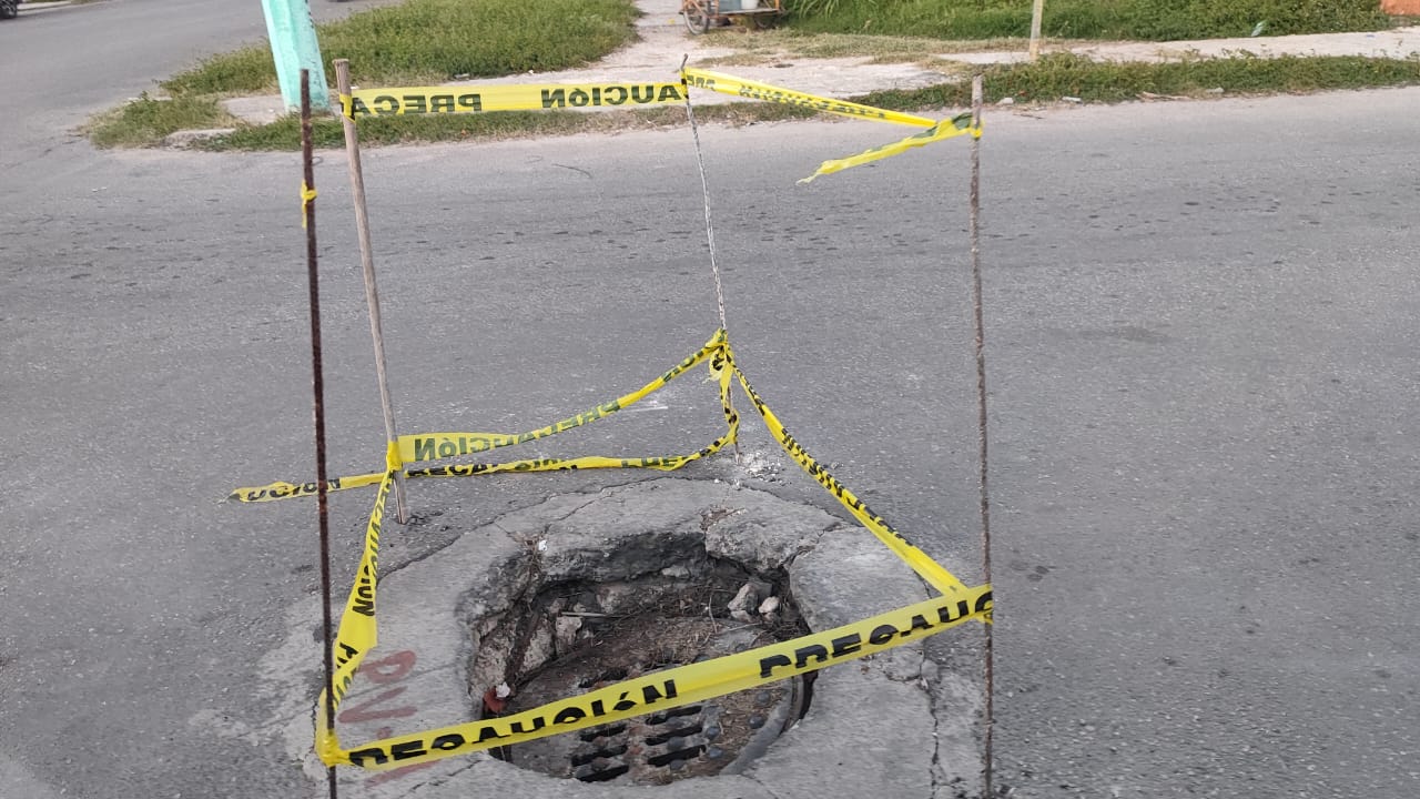 CHETUMAL, 3 de noviembre. – El desfonde de una tapa de alcantarilla en el cruce de la calle Luis Cabrera con Prolongación Héroes, frente al kínder Carmen Serdán, es en un peligro latente para peatones, estudiantes y automovilistas que transitan diariamente por la zona. Desde hace más de seis meses, vecinos y docentes denunciaron la situación ante el Ayuntamiento de Othón P. Blanco, sin que hasta ahora exista una solución definitiva. La única acción reciente —una improvisada señalización con varillas y cinta amarilla colocada hace una semana— es considerada por los residentes como una medida simbólica e ineficaz, especialmente durante la noche o en condiciones de lluvia.