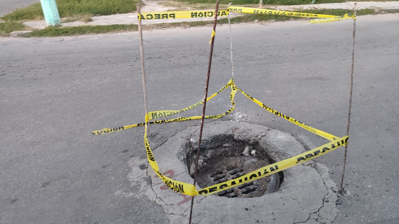 CHETUMAL, 3 de noviembre. – El desfonde de una tapa de alcantarilla en el cruce de la calle Luis Cabrera con Prolongación Héroes, frente al kínder Carmen Serdán, es en un peligro latente para peatones, estudiantes y automovilistas que transitan diariamente por la zona. Desde hace más de seis meses, vecinos y docentes denunciaron la situación ante el Ayuntamiento de Othón P. Blanco, sin que hasta ahora exista una solución definitiva. La única acción reciente —una improvisada señalización con varillas y cinta amarilla colocada hace una semana— es considerada por los residentes como una medida simbólica e ineficaz, especialmente durante la noche o en condiciones de lluvia.