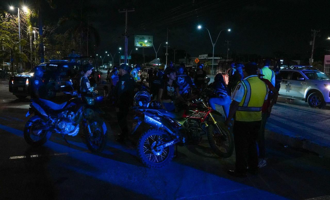El dispositivo se llevó a cabo la noche de ayer en dos puntos estratégicos de la ciudad: la avenida José López Portillo, en la Supermanzana 103, y el cruce de las avenidas Chac Mool y Francisco I. Madero, donde se reportó la presencia de grupos de motociclistas realizando arrancones y acrobacias que ponían en riesgo la seguridad de conductores y peatones.