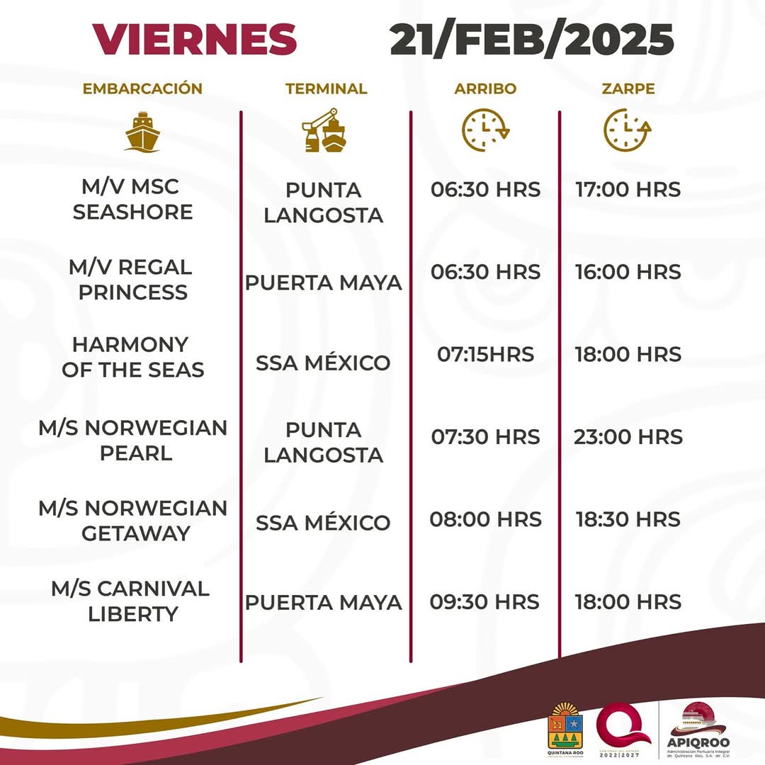 Este día la actividad portuaria de gran calado se reparte entre los tres muelles internacionales de la isla, con casas llenas en el SSA México y Punta Langosta. El primero recibe al Harmony of the Seas de 07:15 a 18 horas y al Norwegian Getaway de 08 a 18:30 horas, mientras que en su vecinoPuerta Maya anclaron el Regal Princ de 06:30 a 16 horas, el Carnival Liberty de 09:30 a 18 horas. Además que en el céntrico Punta Langosta atracaron el MSC Seahore de 06:30 a 17 horas y el Norwegian Pearl de 07:30 a 23 horas.