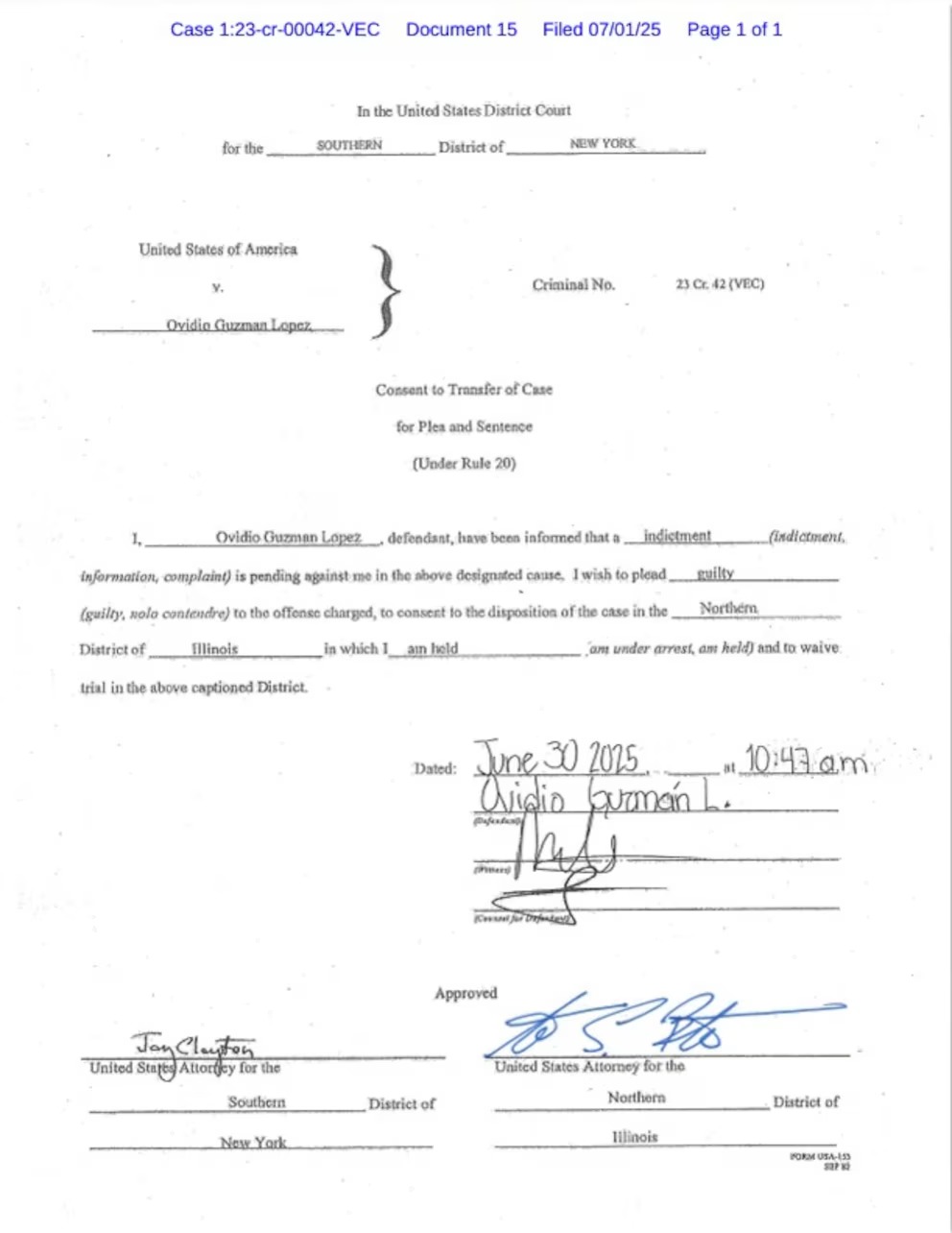 Ovidio Guzmán López, el heredero más joven de Joaquín “El Chapo” Guzmán Loera, se declaró culpable este viernes ante la jueza Sharon Johnson Coleman en la Corte Federal del Distrito Norte de Illinois, en Chicago. Asumió responsabilidad por cuatro delitos graves relacionados con narcotráfico, lo que le permite convertirse formalmente en colaborador del gobierno estadounidense.