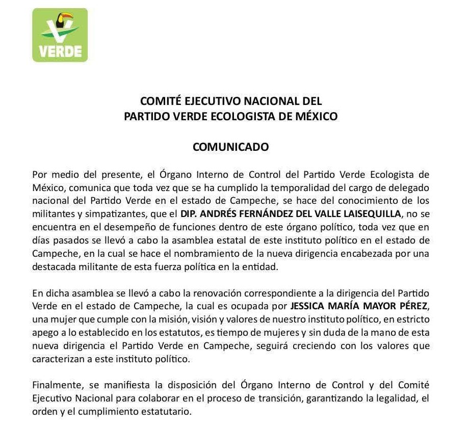 San Francisco de Campeche, Cam., 28 de octubre.- Este martes, el Partido Verde Ecologista de México (PVEM), que lo hizo legislador plurinominal en Campeche, estado en el que en realidad no reside, informó que Andrés Fernández del Valle Laisequilla ya no representará en esta entidad.