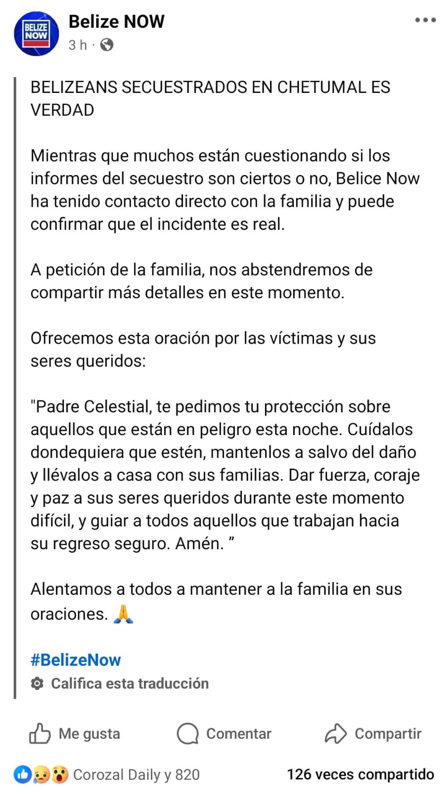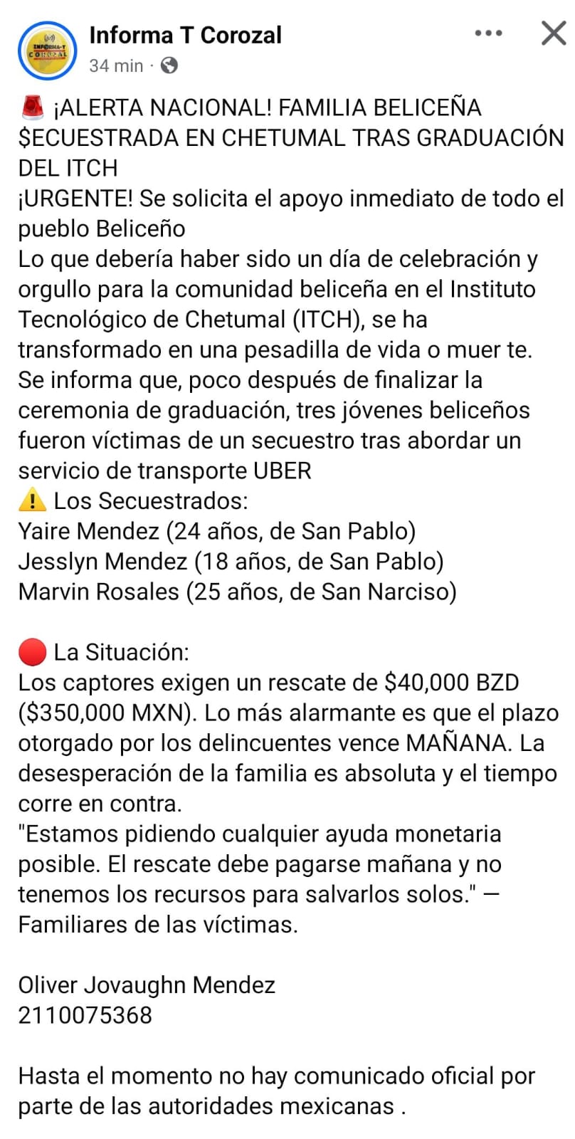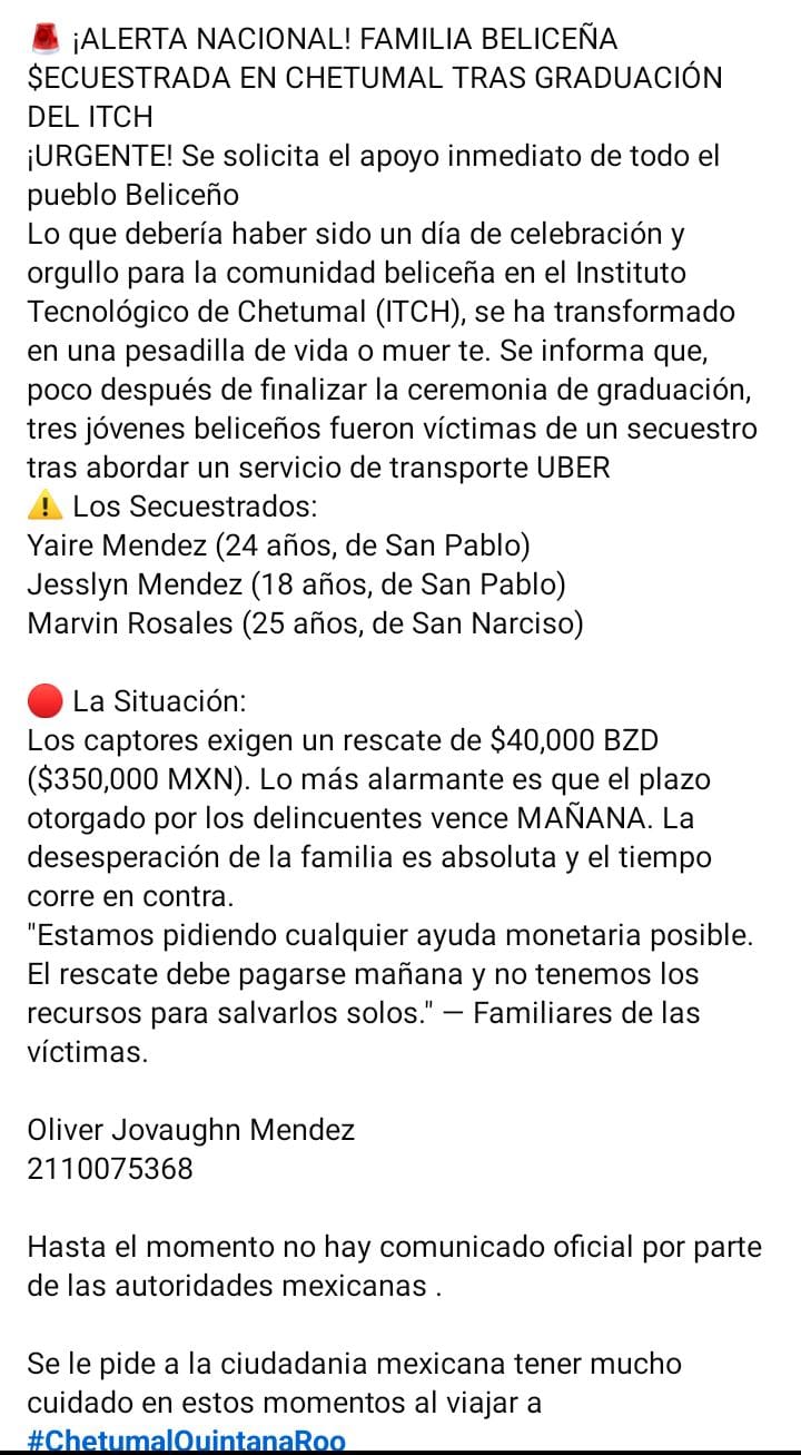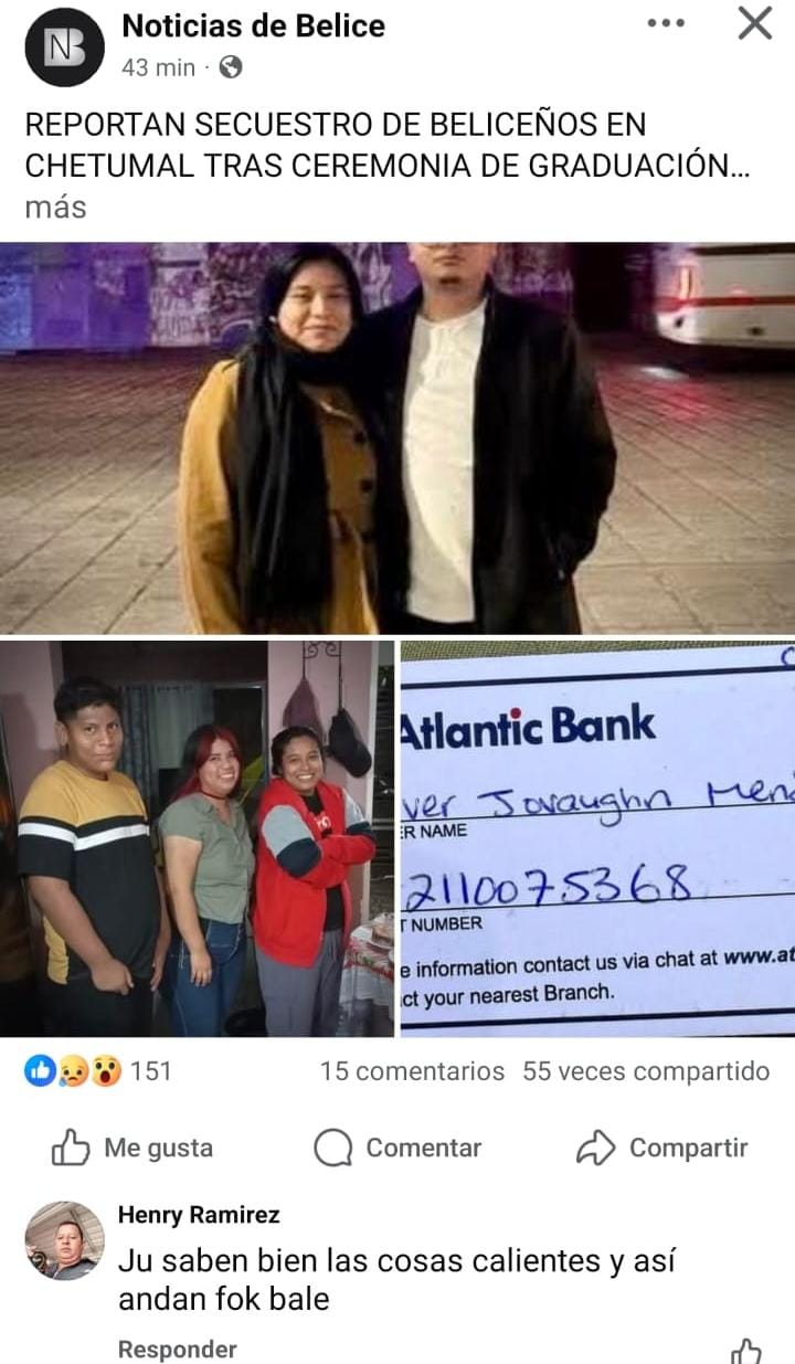 En las redes sociales del país vecino, la publicación ha generado una lluvia de oraciones y mensajes de apoyo para las supuestas víctimas, pero también críticas hacia el manejo de la información. Algunos usuarios señalaron que Belize NOW habría publicado previamente datos sensibles como nombres completos e información bancaria, lo que podría poner en mayor riesgo a los involucrados. Mientras tanto, en Chetumal, el ambiente es de cautela, pues el flujo de visitantes beliceños es vital para la economía local y un rumor de esta magnitud, confirmado o no, afecta directamente la confianza de quienes cruzan la frontera para realizar compras o trámites médicos.